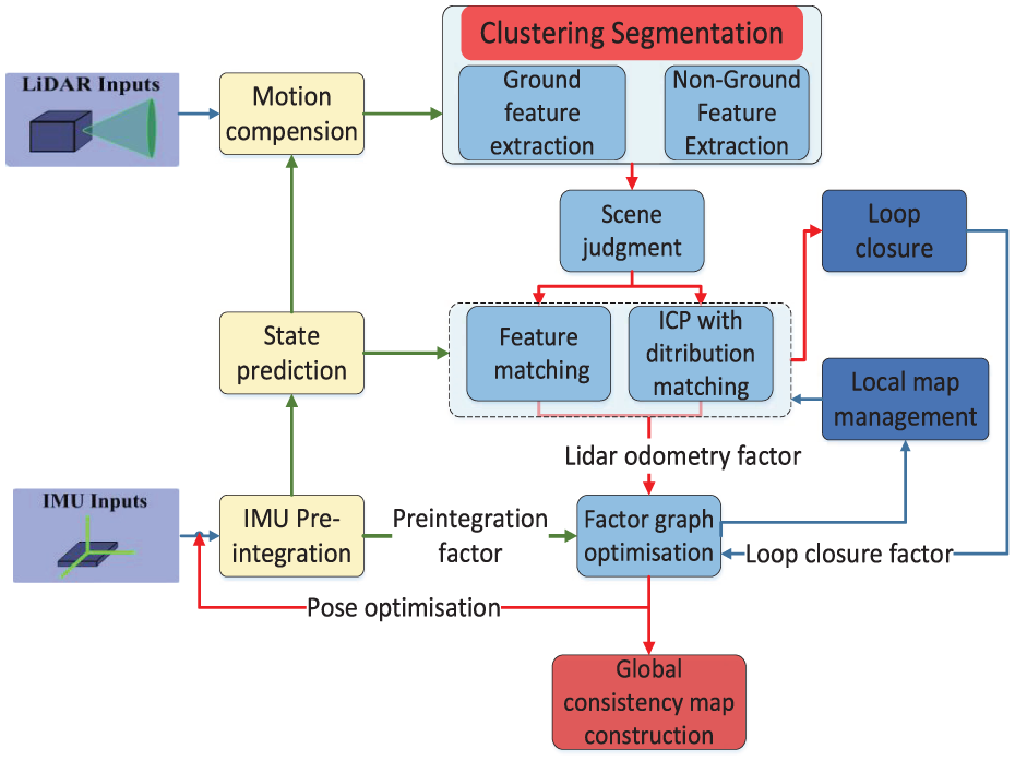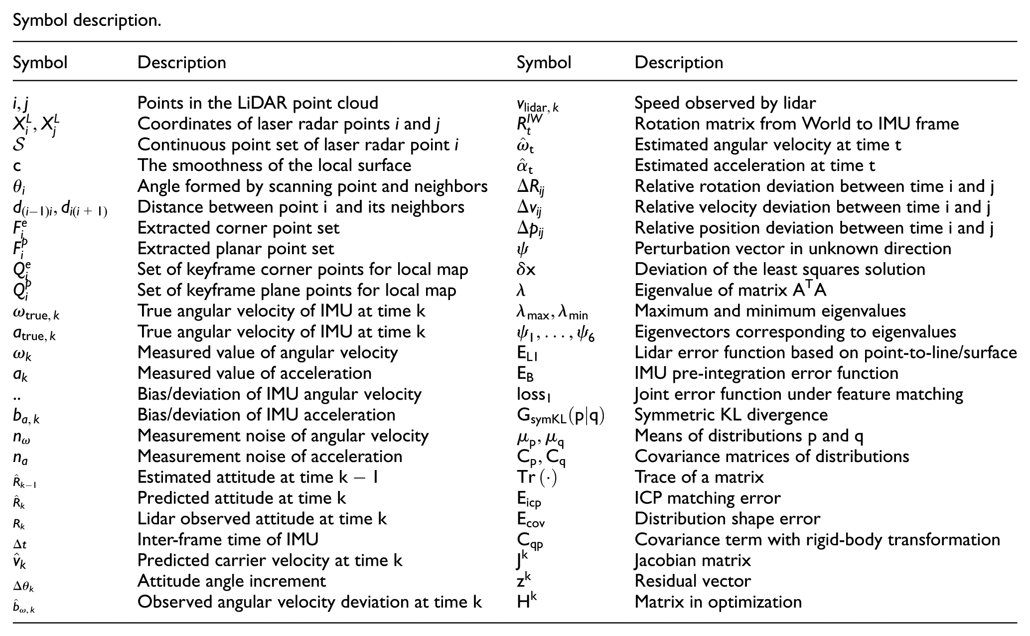 Currently, a mature 3D laser SLAM framework consists of four core modules: front-end scanning and matching, back-end optimization, loop-back detection and map construction. Based on the point cloud data measured by lidar, the front-end performs inter-frame alignment through scanning matching, closed-loop detection, to obtain the relationship of point cloud data between different frames, continuous updating of position estimation and storage of corresponding map information. A system for real-time high precision 3D mapping of the surrounding environment is proposed in Li et al., 19 which enables quick and convenient operation to obtain high precision data. The positioning accuracy in urban environments can reach 0.06%. Literature 20 proposed a continuous time lidar inertial odometry (CT-LIO) system, which is more efficient than commonly used nonlinear solvers. The back end obtains the maximum likelihood estimation of the constructed map, along with the robot position, by maintaining and optimizing the robot position and observation constraints obtained from the front-end.21–23 As the mass production and popularity of lidar increases, 3D lidar has started to move toward low-cost, low-power and high-reliability applications, while 3D lidar-based SLAM algorithms are being rapidly developed. LOAM 24 (Lidar Odometry And Mapping) is the most representative 3D laser SLAM algorithm, different from traditional algorithms such as NDT 25 and ICP, 26 which proposes the concept of feature points and improves the efficiency of the alignment by replacing the alignment between the whole point cloud with the alignment between the corner points and the plane points. By running map building and positioning separately at different frequencies, it achieves fast speed, high accuracy and good robustness. However, the lack of back-end optimization leads to a more serious drift problem, arising from large environment map building. SHAN introduced a point cloud segmentation and loop-back detection module, to solve the problem of degradation of solution accuracy, caused by insufficient stability of point features in LOAM, proposing LEGO_LOAM, 27 which achieves a similar or even better accuracy while requiring less computational resources. An even more enhanced approach is the open-source livox_loam, 28 from the University of Hong Kong, which employs a more stringent strategy for feature point extraction and adds filtering of outlier and dynamic points, as well as loop-back detection. M_LOAM 29 improves the perception range of the robot, by combining inputs from multiple lidars, constructing a global map and combining enough observations to optimize the position estimation and try to reduce the measurement and estimation uncertainty. However, these SLAM algorithms, which only use lidar to obtain observations, are prone to the problem of positioning drift, when faced with excessive speed or steep corners.