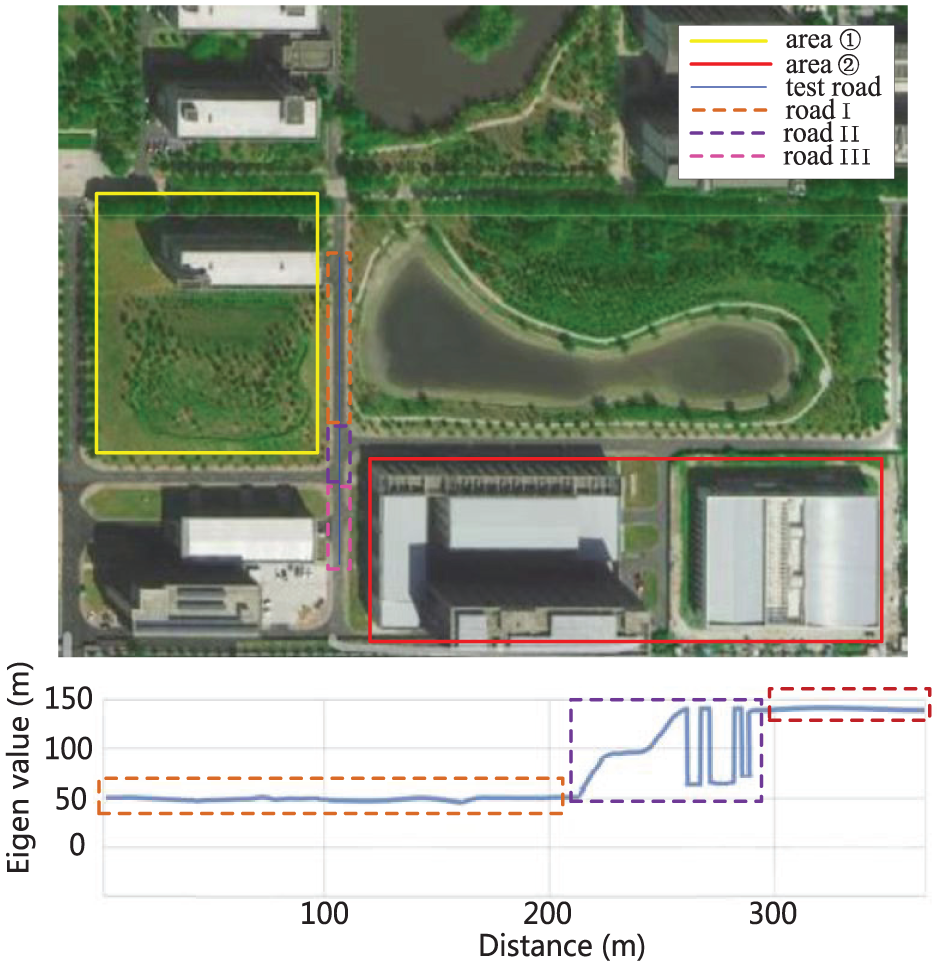 Within the experimental environment, a building area with more structured information and a square lawn area with less structured information are selected (Figure 10) and denoted as area ① and area ②, respectively. The test road covers areas ① and ②, which consists of road I, road II and road III. The experimental path and its corresponding eigenvalue curve is shown in the lower part of Figure 10. It can be seen that when driving in the road I section that lacks features, the eigenvalue is lower than the threshold (the maximum eigenvalue) and in this area it is prone to reduced positioning accuracy or loss of positioning. In the boundary part of the two regions, namely road II, the eigenvalue fluctuates above and below the threshold value, while when driving in the section of road III with obvious features, the eigenvalue is higher than the set threshold value.