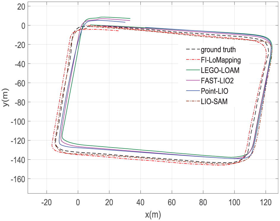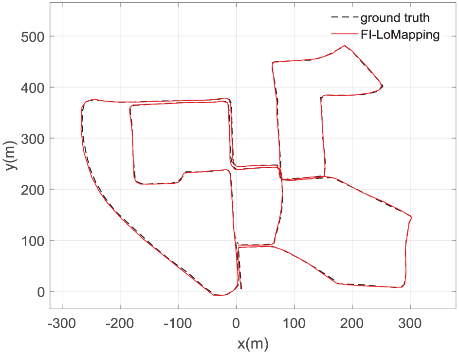 The trajectory curve of FI_LoMapping Algorithm is shown in Figure 8. It can be seen that the positioning error of FI_LoMapping is relatively small on straight road sections, but the error is large during the turning process. The main reason is that in straight road sections, the SLAM system can obtain more and more stable constraints to correct its position. When turning, these constraints become scarce and unstable in a short period of time, leading to error accumulation. In addition, during rapid steering of IMU, the accelerometer is affected by centrifugal force, resulting in more pronounced drift. However, compared to the other four algorithms, FI_LoMapping algorithm still has good reliability and higher positioning accuracy.