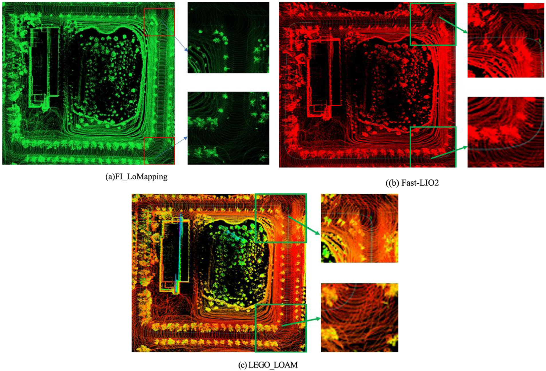 The point cloud maps constructed by FI_LoMapping, Fast_LIO2 and LEGO_LOAM in Region ① and their local details are shown in Figure 13. It can be seen that the point cloud maps, constructed by the multi-sensor tightly coupled SLAM, proposed in this paper, shows high consistency with the actual environment, while features, such as walls and tree trunks, under the local maps, do not have problems, such as ghosting and blurring.