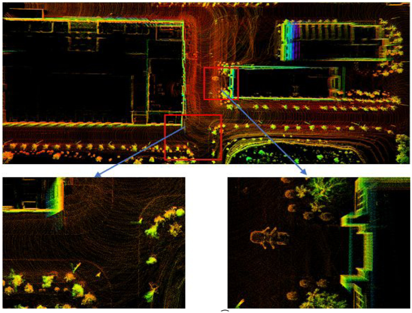 In region ② with distinct structured features, the point cloud map its detailed parts established by FI_LoMapping algorithm is shown in Figure 14. It can be seen that the constructed 3D point cloud map has a high degree of consistency with the actual environment. The walls in the local map do not have ghosting due to inaccurate positioning, and the features such as tree trunks on both sides of the road do not appear blurry problem. The above experiments indicate that the FI_LoMapping algorithm has high map construction and localization performance in both structured and unstructured scenarios.