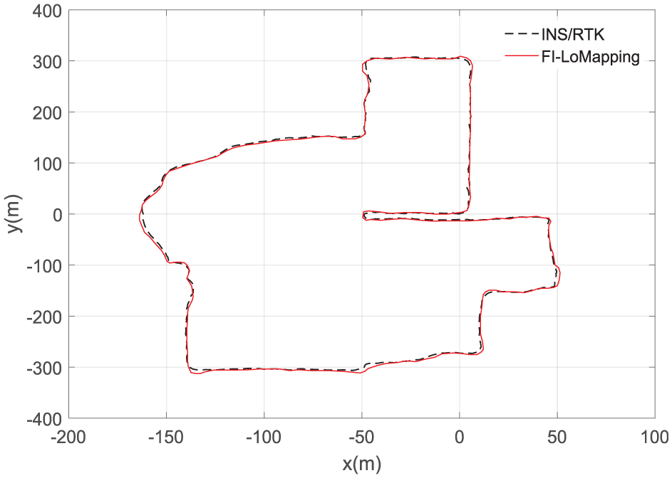 In complex environments, complex trajectories with emergency turns and U-turns were selected for testing, including structured features such as asphalt roads and buildings, as well as unstructured features such as trees and lakes. In addition, the test trajectory also includes challenging conditions such as emergency left and right turns, right angle turns, and stationary U-turns. The trajectory recorded by INS/RTK in the experiment and the trajectory output by FI_LoMapping Algorithm are shown in Figure 16. It can be seen that in straight road sections, the output trajectory of Algorithm FI_LoMapping is close to INS/RTK. However, there is a certain positioning error during the turning process, mainly caused by the lack of environmental features and IMU drift. This situation is consistent with the simulation results.