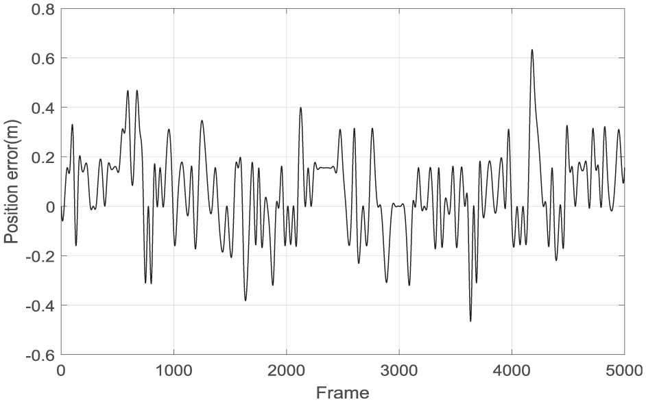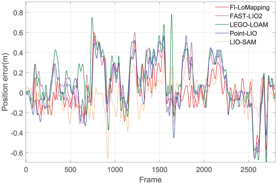 In the experiment, compared with INS/RTK devices with high-precision positioning, the positioning error of FI_LoMapping Algorithm in each frame is shown in Figure 17. It can be seen that the maximum error in the entire experiment is 0.634 m, with a variance of 0.0262 m2 and a standard deviation of 0.162 m. This reflects that FI_LoMapping algorithm has high positioning stability and accuracy in complex environments containing structured and unstructured features.