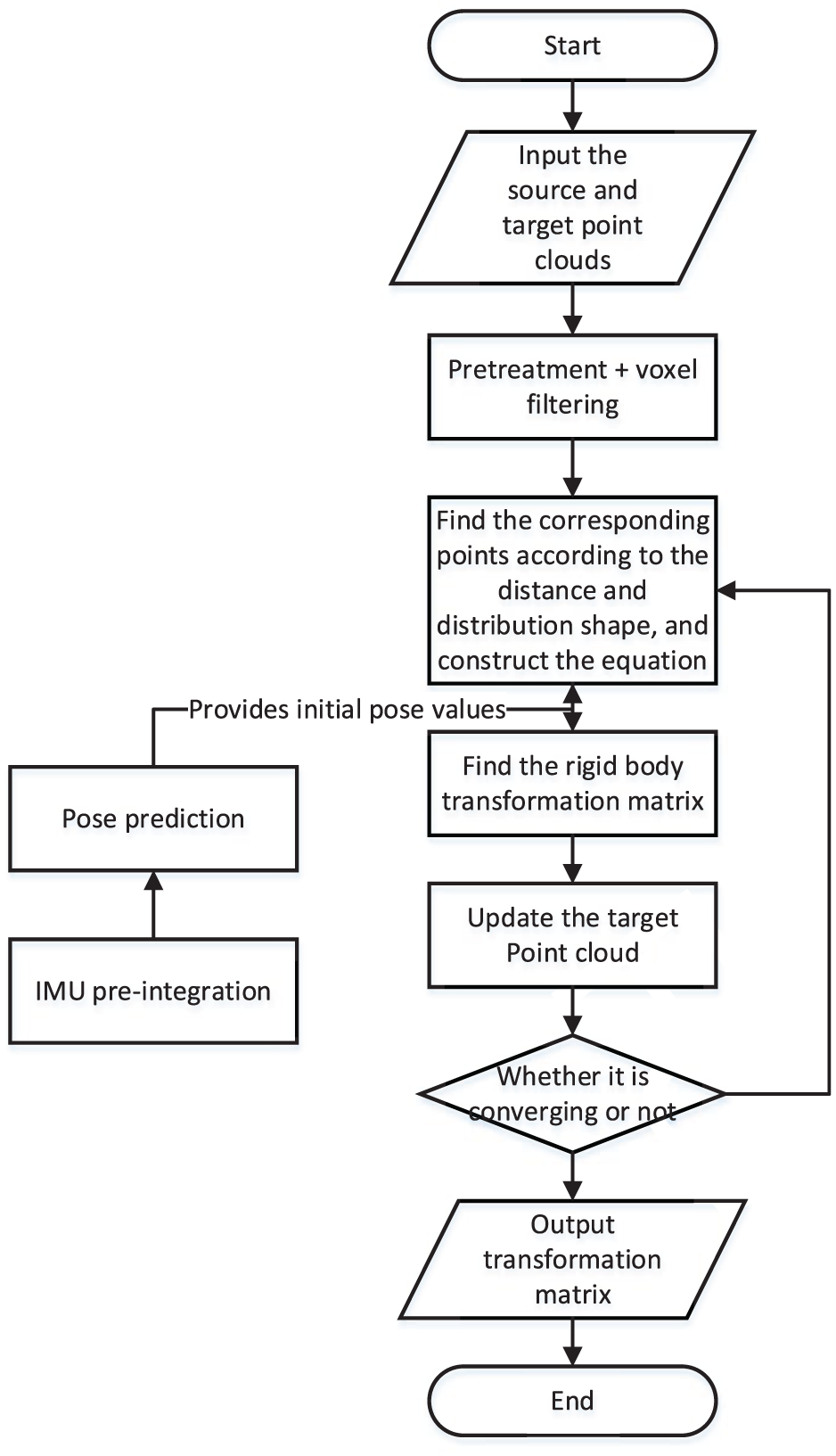 There are irrationality in this assumption, and a certain number of incorrectly corresponding points are generated during the matching process. Based on this, voxel grid maps are used in a way to reduce the number of points used for point cloud alignment, without limiting the matching accuracy as a result. The cost function used includes not only the distances between the points of the same name, the IMU error function, but also the differences between the shapes of the distributions. In this case, even though the distance between points of the same name is small, the same mismatch in the shape of the distributions leads to a large cost function and thus non-convergence. The flowchart for improving the ICP algorithm is shown in Figure 2. Since ICP is a distance minimization algorithm, the scatter with symmetry of two Gaussian distributions