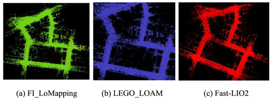 Compared to the Fast_LIO2, the advantages of the FI_LoMapping algorithm proposed in this paper are reflected in scene adaptability, matching strategy, and error constraints. On the one hand, the point cloud registration of Fast_LIO2 only considers the spatial distance of point clouds without additional constraints. The improved ICP algorithm of FI_LoMapping incorporates the distribution shape difference and IMU error into the cost function, adds mean and covariance constraints of Gaussian distribution and even if the distance between corresponding points is close, the mismatch of distributions will trigger error penalties, reducing incorrect matches. On the other hand, Fast_LIO2 reduces computational complexity through iterative Kalman filtering, focusing solely on state dimension optimization. FI_LoMapping constructs an IMU-Lidar joint error function, iteratively optimizes pose and IMU errors during the SLAM process and simultaneously fuses three types of factors: IMU pre-integration, laser odometry, and loop detection through a factor graph, avoiding the local optimum problem of a single sensor. In addition, compared to another LIO_SAM algorithm, the FI_LoMapping algorithm addresses the limitations of LIO_SAM, which lacks scene differentiation and has a single matching strategy. On the one hand, LIO_SAM is based on LEGO_LOAM’s ground optimization and feature extraction, and only adopts a fixed strategy of line-surface feature matching, resulting in unstable feature extraction in weak feature environments. FI_LoMapping, also built on the LEGO_LOAM framework, incorporates a scene determination module, integrating an adaptive tight-coupling framework of feature matching and distributed constraint ICP. On the other hand, LIO_SAM’s matching relies entirely on corner/plane point line-surface features, without an ICP registration step, leading to poor registration results when features are insufficient. FI_LoMapping combines feature matching with an improved ICP. For ICP in degraded scenes, it reduces computational load through voxel grid downsampling, enhancing constraint strength while maintaining real-time performance.
