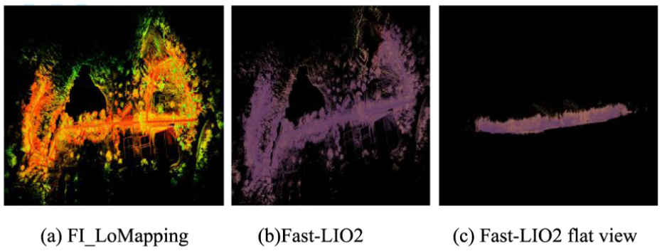 Cloud map of unstructured scene points: (a) FI_LoMapping, (b) Fast-LIO2 and (c) Fast-LIO2 flat view.