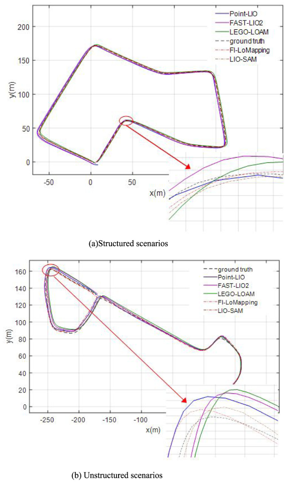 Unlike industrial robotic arms that execute a high-precision, repeatable motion trajectory to complete a specific task in a known and structured environment,41,42 the trajectory output by SLAM systems needs to include the position and orientation of each moment in the future. The generation of trajectories is closely related to the vehicle’s driving environment, so trajectory error analysis needs to be carried out under different environmental and road conditions.