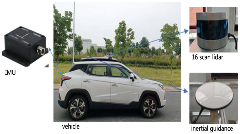 A real vehicle testbed (Figure 9) is constructed, including a 16-line mechanical rotating lidar, IMU and a set of high-precision inertial combined navigation (INS/RTK; used only to provide true values for the SLAM system). The test vehicle is an autonomous vehicle that does not involve any human participants. The movement of the vehicle is controlled by a VRW-6700 computer with a quad core i5-7260U CPU.The experimental parameters and detailed configuration process can be found in Appendix 2.