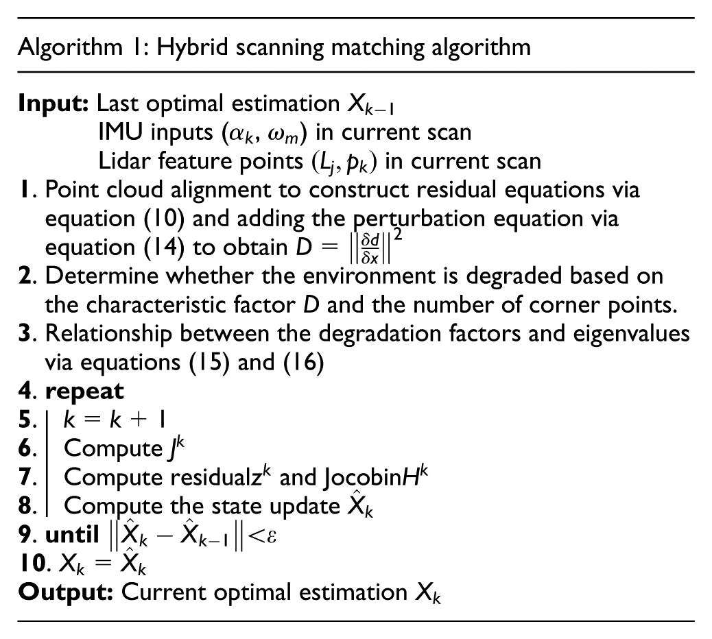 In structured information-rich scenarios, due to the large number of alignment points, the point-to-point based ICP matching algorithm is computationally inefficient. In scenarios with less structured information, it is difficult for feature-based matching algorithms to extract stable and reliable features, making those based on line and surface features perform less well. Therefore, a hybrid scanning matching algorithm is proposed in this paper. Based on a perturbation model-based approach, it is determined whether the environmental features are degraded. A point-to-line and surface-based feature matching algorithm is used in scenarios with rich environmental features. When the environmental features are degraded and sufficient constraint information cannot be extracted, the ICP scanning matching mode, which introduces distributed shape constraints, is activated. The pseudo-code for the hybrid scanning matching algorithm is shown as follows: