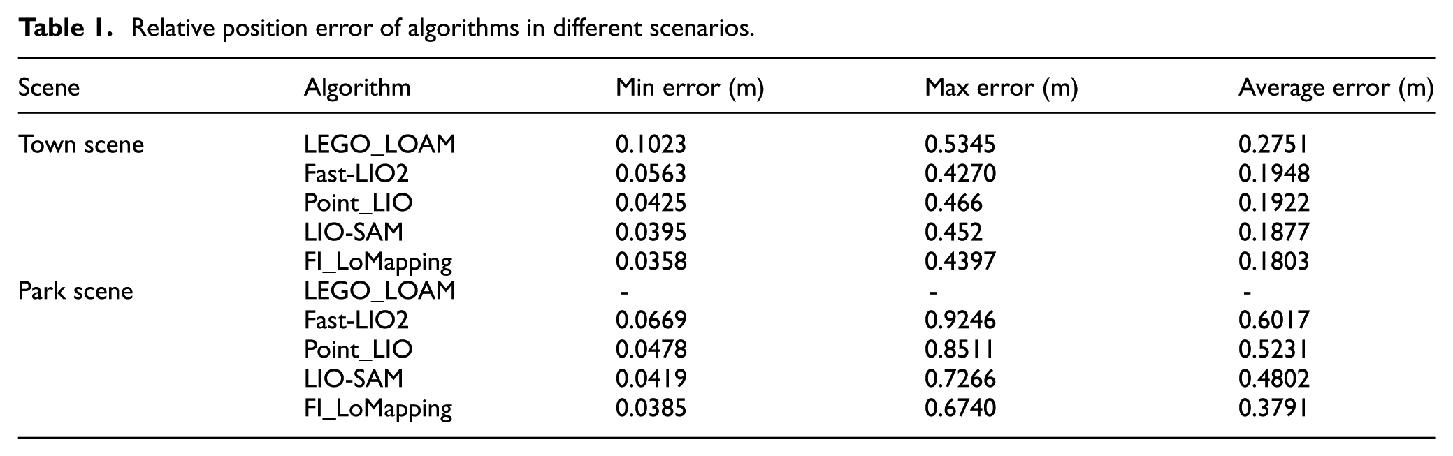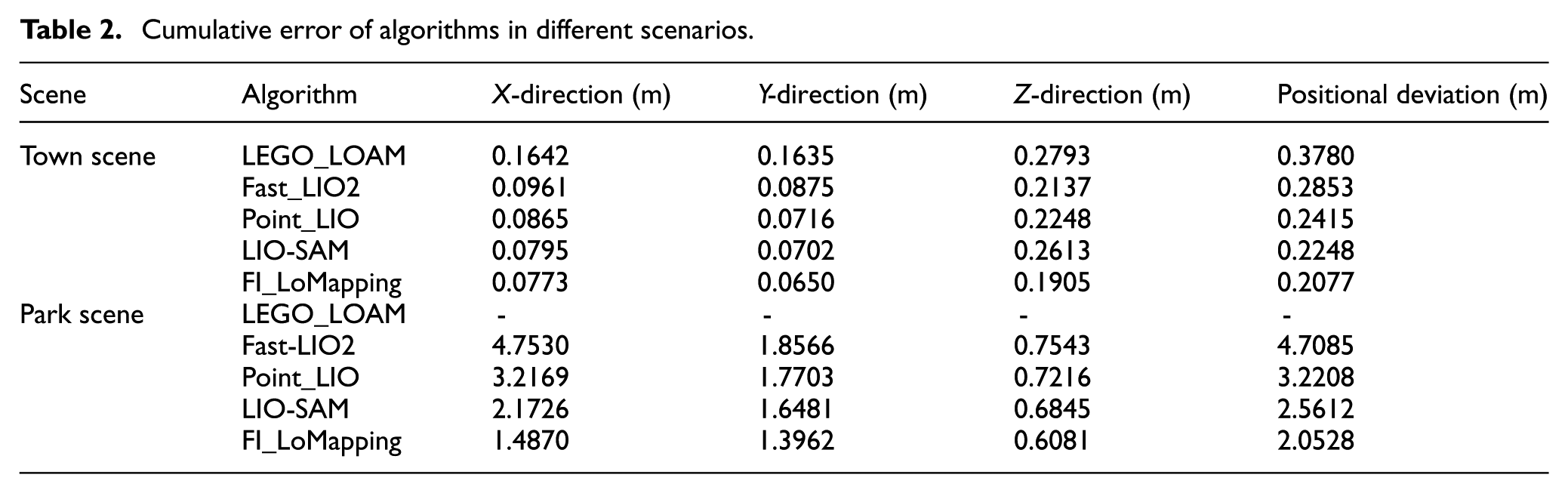 In the town scene, the FI_LoMapping algorithm outperforms the LEGO_LOAM, Fast_LIO2, Point_LIO, LIO-SAM algorithms by 34.5%, 7.4%, 6.2%, 3.9% respectively, in the structured and rich featured town scene. Due to the distinct features of buildings and roads in urban scenes, both LIO-SAM and the FI_LoMapping algorithm proposed in this paper exhibit good localization performance. In the park scene, where relatively little structured information available, the FI_LoMapping algorithm deviates a maximum of 0.6740 m and a minimum of 0.0385 m, which represents a 36.9%, 27.5%, 21.1% improvement over the Fast-LIO2, Point_LIO, LIO-SAM algorithm. In addition, LEGO_LOAM algorithm shows poor positioning accuracy during map building and drifts so badly that the map cannot be built.