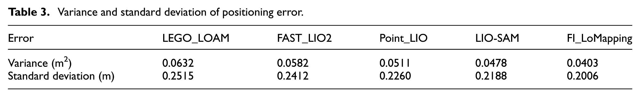 In Figure 7, it can be seen that in complex scenes with frequent turns, the maximum positioning error of the FI_LoMapping algorithm is 0.55 m, while the maximum positioning errors of the LEGO_LOAM, FAST_LIO2, Point_LIO, LIO-SAM algorithms are 0.78, 0.6, 0.66, 0.65 m respectively. In addition, in Table 3, the variance and standard deviation of the FI_LoMapping algorithm are 0.0403 m2 and 0.2006 m, which are 21.13% and 11.23% lower than those of the Point_LIO algorithm. Compared to LIO-SAM, the variance and standard deviation of FI_LoMapping have been reduced by 15.6% and 8.3%, respectively.
