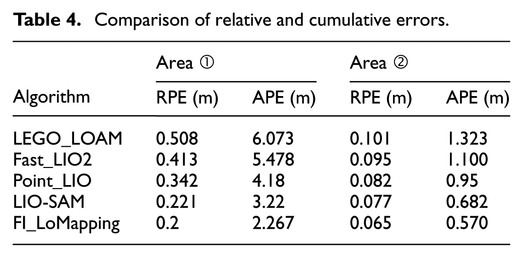 The Root Mean Square Error (RMSE) values of relative position error (RPE shift) and absolute position error (APE) for the five algorithms are listed in Table 4. It can be seen that, compared to the LEGO_LOAM algorithm, the relative and cumulative errors of FI_LoMapping algorithm are reduced by 0.308 and 3.770 m in region ①, and by 0.036 m and 0.753 in region ②, respectively. Compared to the LIO-SAM algorithm, the relative and cumulative errors of the FI_LoMapping algorithm are reduced by 0.0.21 and 0.953 m in region ① and by 0.012 and 0.112 m in region ②, respectively. The results prove that FI_LoMapping can further improve the accuracy of the system and its ability to operate stably in large scenarios, both in cases with more structured information, as region ①, as well as in scenarios with less structured information, as region ②.