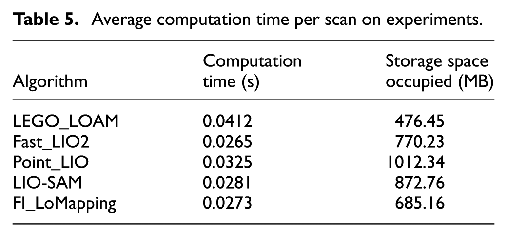 To test the real-time performance of the proposed method on computing platform, we calculated the average computation time per scan of FI_LoMapping, Fast-LIO2, LEGO_LOAM, Point_LIO, LIO-SAM and the results are shown in Table 5. Although Fast-LIO2 achieves optimal time efficiency, the storage space occupied by the algorithm is relatively large, reaching 770.23 MB. The proposed method is fully run in real-time for all the experiments, with competitive performance at around 36 Hz. In addition, the average computation time of FI_LoMapping on experiments is 0.0273 s, as shown in Figure 15. Compared with LEGO_LOAM, Point_LIO, our method demonstrates significant advantages in terms of time efficiency. Similar to FI_LoMapping, LIO-SAM also employs factor graph optimization, and its computation time and memory footprint are basically on the same level.