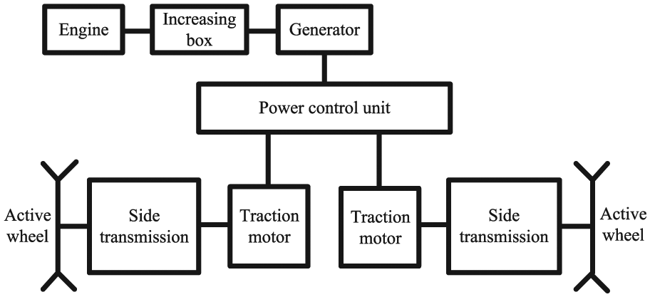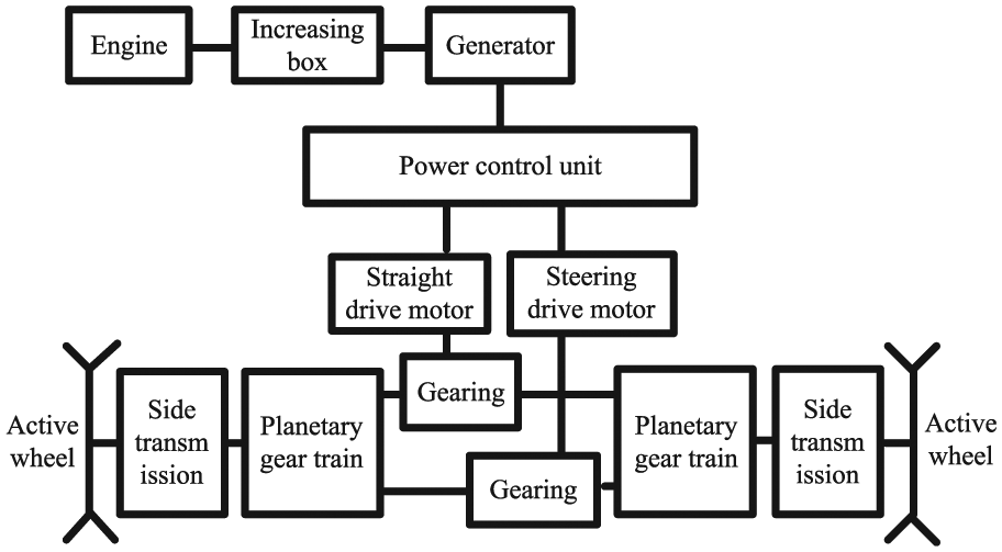 For the transmission of tracked vehicles, there are four main configurations. 1 Among them, the most commonly used configuration has two types: (1) independent driving with dual motors as shown in Figure 1 and (2) cross-drive electric transmission as shown in Figure 2. For example, the armored transport vehicle M113A3 is equipped dual motors that are driven independently. 2 In this form, two motors provide independent drive to each roller. The advantage of this configuration is that the motors can be arranged easily.