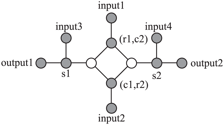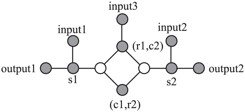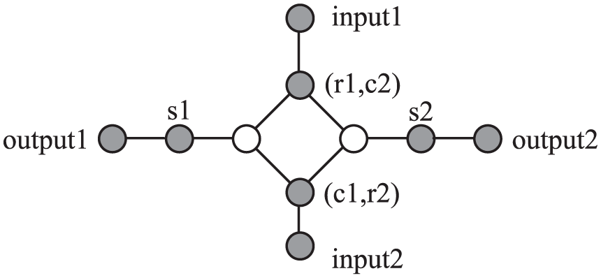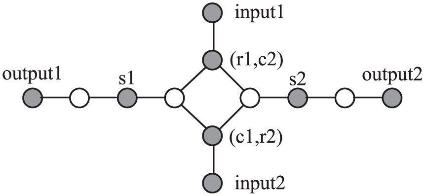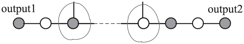 Any path between the two outputs contains at least one gray node of degree more than 2.