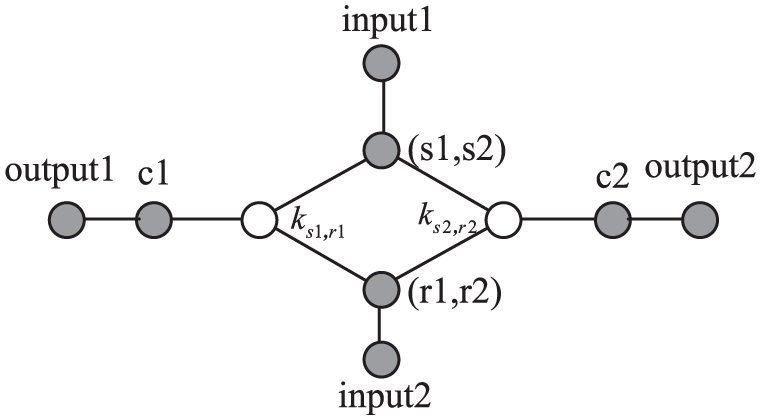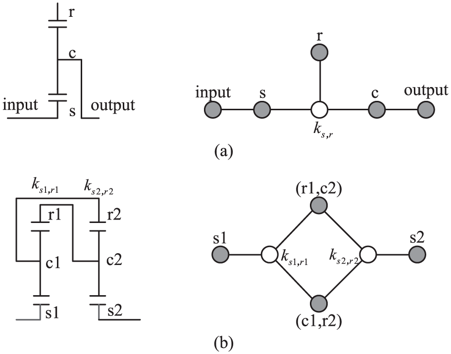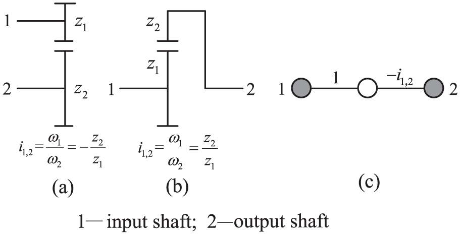 Speed conversion mechanism has many forms, for example, a gear pair, as shown in Figure 7(a) and (b). The graph representation of the gear pair is a path with two gray nodes and one white node as shown in Figure 7(c). The two gray nodes represent the input and output, respectively.