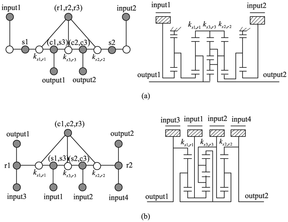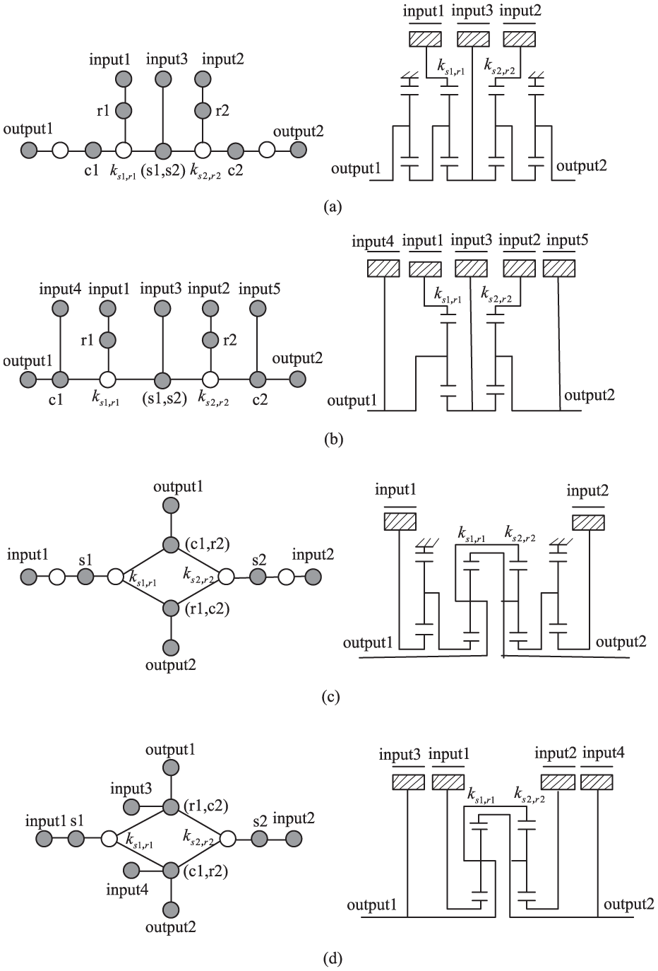 Using the configuration synthesis method proposed in this article, many configurations can be obtained, which can be classified according to the speed DOF and the torque DOF. Figure 19 shows several configurations with two PGTs, and Figure 20 shows several configurations with three PGTs. Following are some of the inferences.