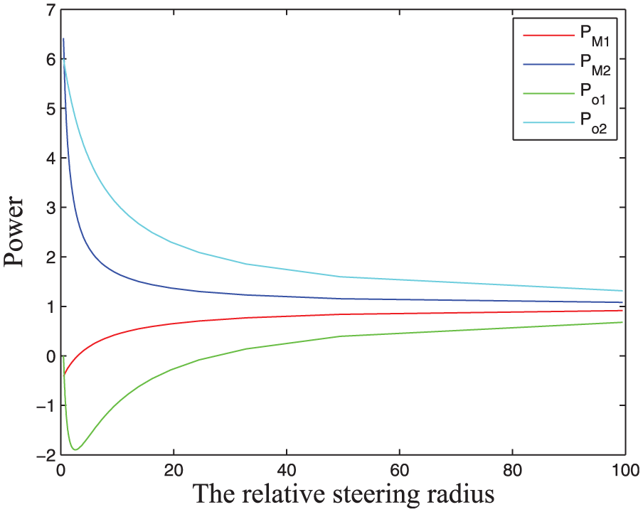 For the configuration shown in Figure 3, the net power absorbed by the two traction motors is lower than the power required by the two side tracks in most of the operating states. The relative output power of the two side tracks as a function of relative steering radius is shown in Figure 4. Let