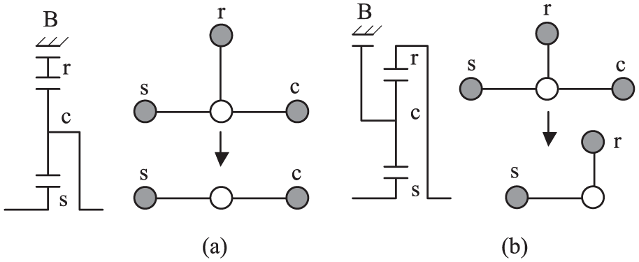 If the rotation of any link is prevented, then the PGT would become a speed conversion mechanism, which can be represented by deleting the corresponding nodes as shown in Figure 8.