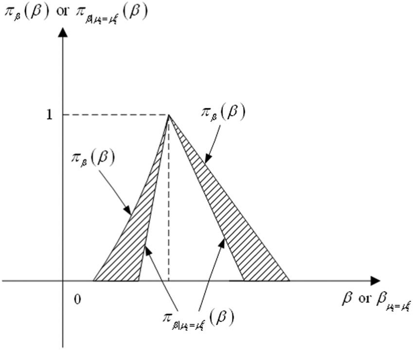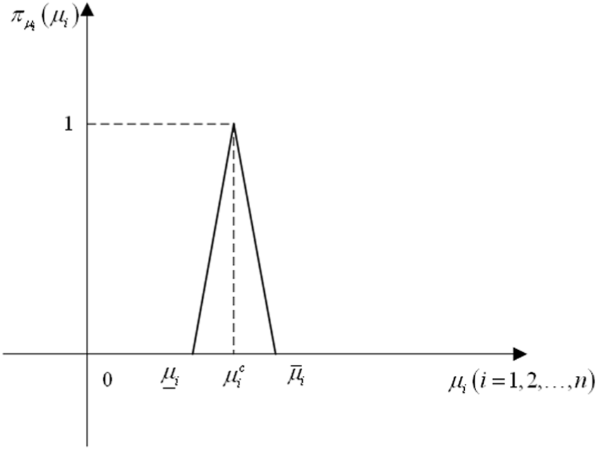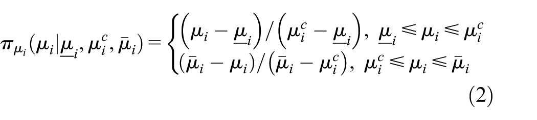 where is the MF of imprecise mean , and and represent the lower and upper limits of imprecise mean with ; and is the core of imprecise mean with . In this work, is denoted by as shown in Figure 1, and , , and are the core vector, lower limit vector, and upper vector of imprecise mean vector .