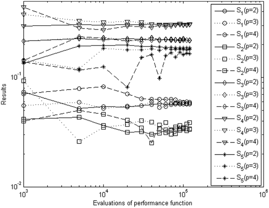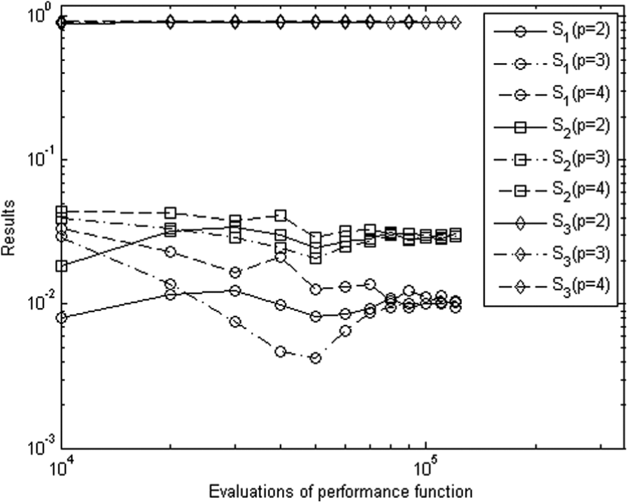 In order to construct the IS PDF, the traditional IS method needs to solve the design points beforehand. As shown in section “Traditional IS method,” we have to perform independent traditional IS runs for evaluation of , which may be prohibitive. However, constructing the proposed IS PDF is more easier, and only an IS run is needed to obtain .