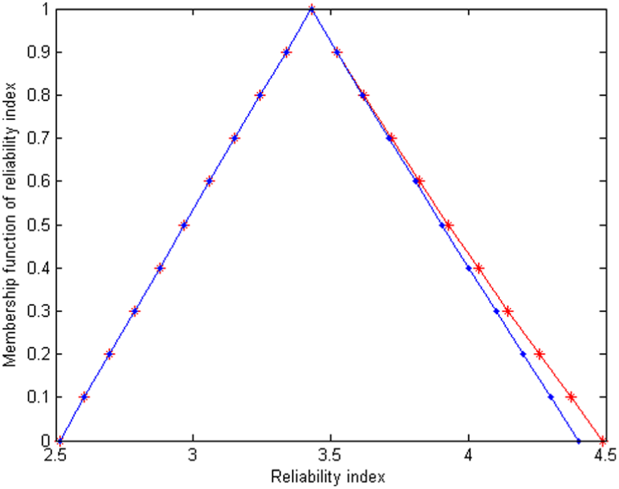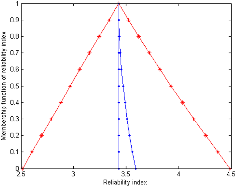 where is the inverse cumulative distribution function of standardized normal distribution. For the same reason, reliability index is also a fuzzy set defined by a membership function due to uncertainty propagation from imprecise mean vector . MF of reliability index will be regarded as system output performance.