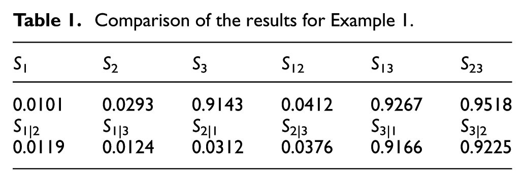Table 1 summarizes the estimated results of the SAI by the proposed method. In order to show the accuracy and the advantages of the proposed method, the direct sampling–based solving method defined in section “Direct sampling–based solving method” is also employed to solve this example. The number of the Monte Carlo (MC) samples for equation (10) is , and the number of values of epistemic uncertain imprecise mean at each is 10,000, and thus we need to generate MC samples to estimate . Two high-performance workstations are employed to estimate the results as , , and . The results show that the proposed method can obtain the estimated results of the SAI with very lower computational cost.