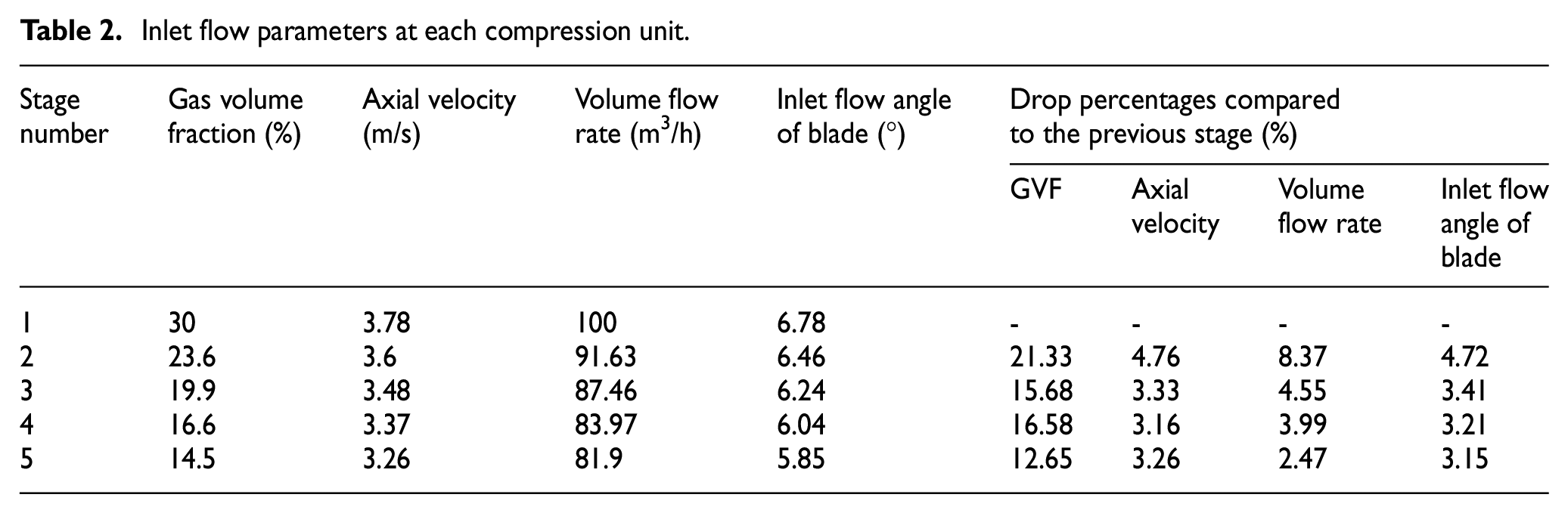 Flow parameters such as volume flow rate, GVF and flow angle at the inlet of each stage in a multi-stage multiphase pump vary along the flow direction, which is mainly due to the gas compressibility of the gas-liquid flow. Therefore, it is necessary to modify the geometry parameters of each stage based on its corresponding inlet flow parameters to improve the pump performance.
