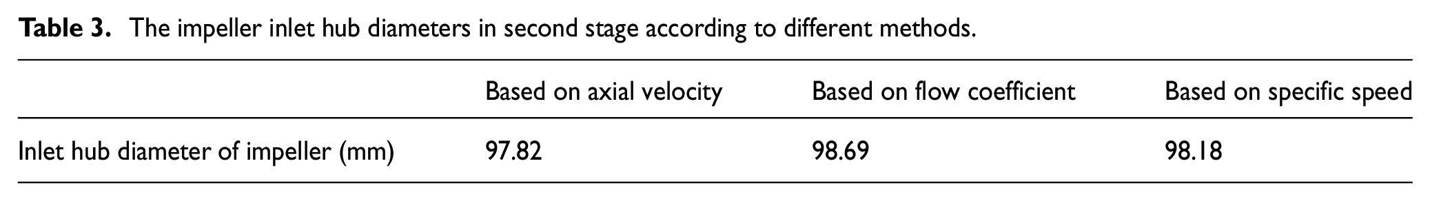 The inlet hub diameter of impeller in the second stage calculated by the above three methods are shown in Table 3. There is not much difference among these three values, which verifies the feasibility of the above methods. After comprehensive analysis and comparison, the inlet hub diameter of impeller in the second stage is set to 98 mm.