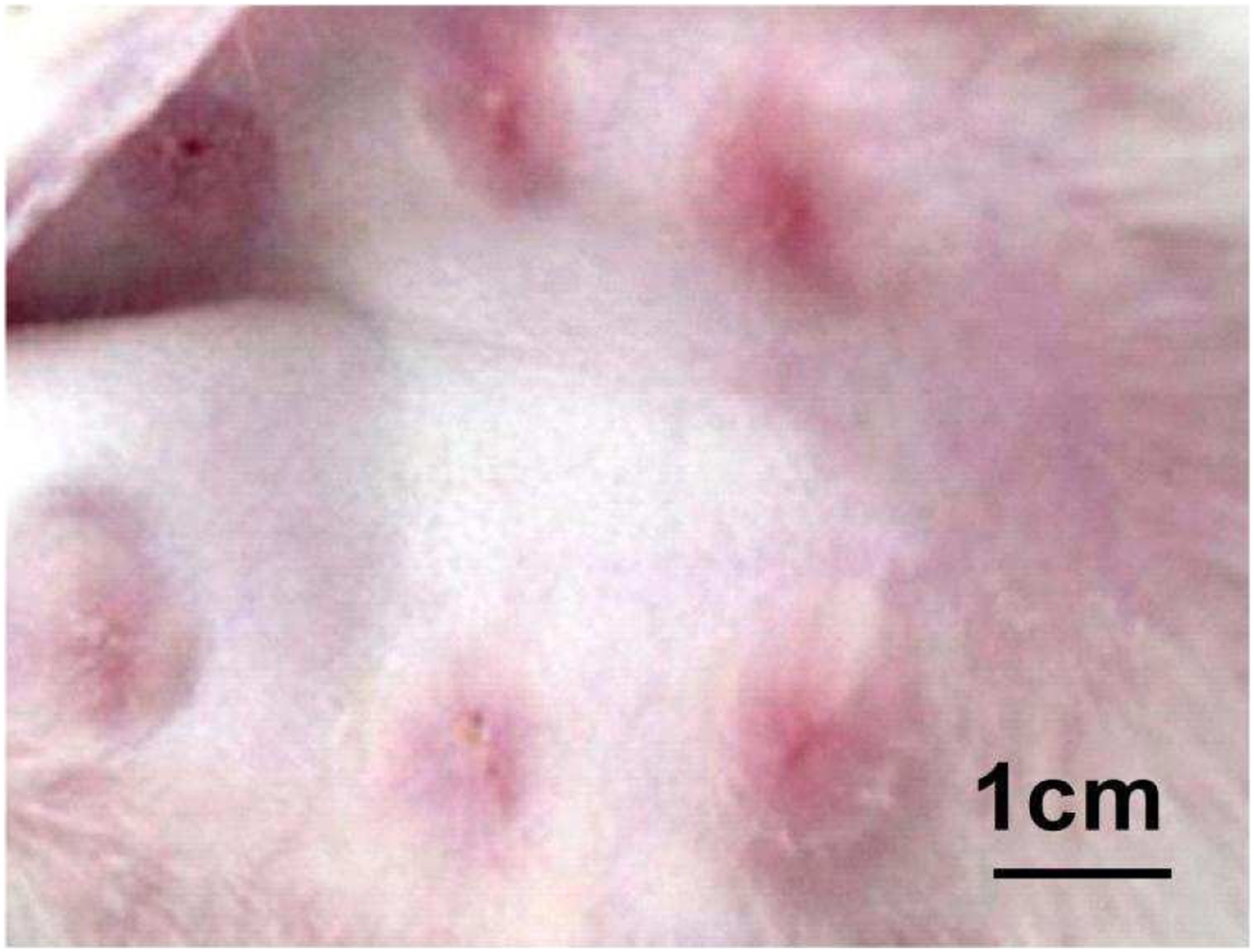 Six scars were created on one ear of each rabbit, which was shown in Figure 1. Hypertrophic scar on rabbit ear. Six scars were created on one ear of each rabbit.