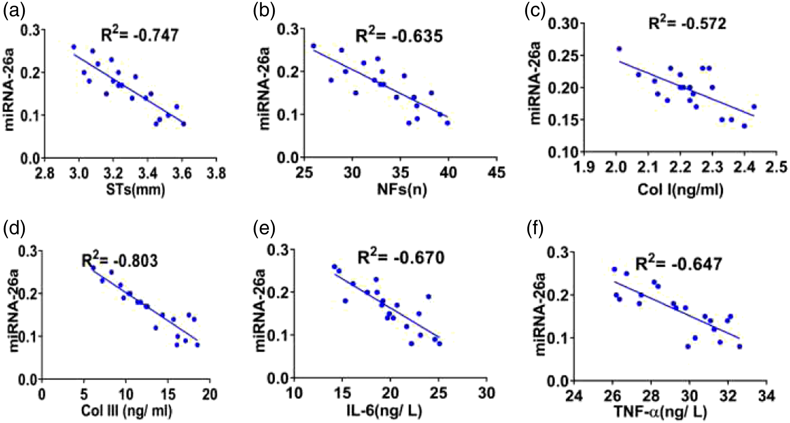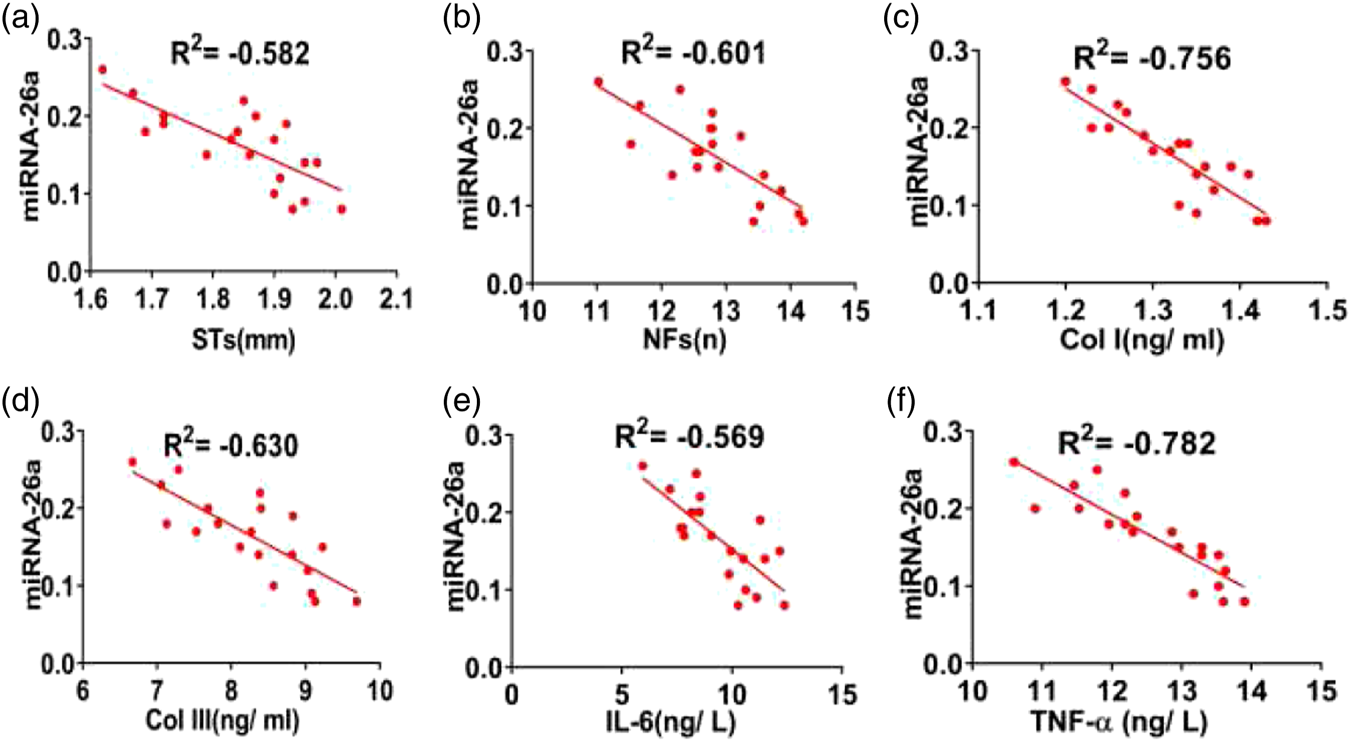 In the scar group, the expression of microRNA-26a was negatively correlated with STs, NFs, Col I, Col III, IL-6, and TNF-α (all Correlation of microRNA-26 in the scar group. (a–f) showed the correlation between microRNA-26a and STs, NFs, Col I, Col III, IL-6, and TNF-α in the scar group (respectively, all Correlation of microRNA-26a in the experimental group. (a–f) showed the correlation between microRNA-26a and STs, NFs, Col I, Col III, IL-6, and TNF-α in the experimental group (respectively, all