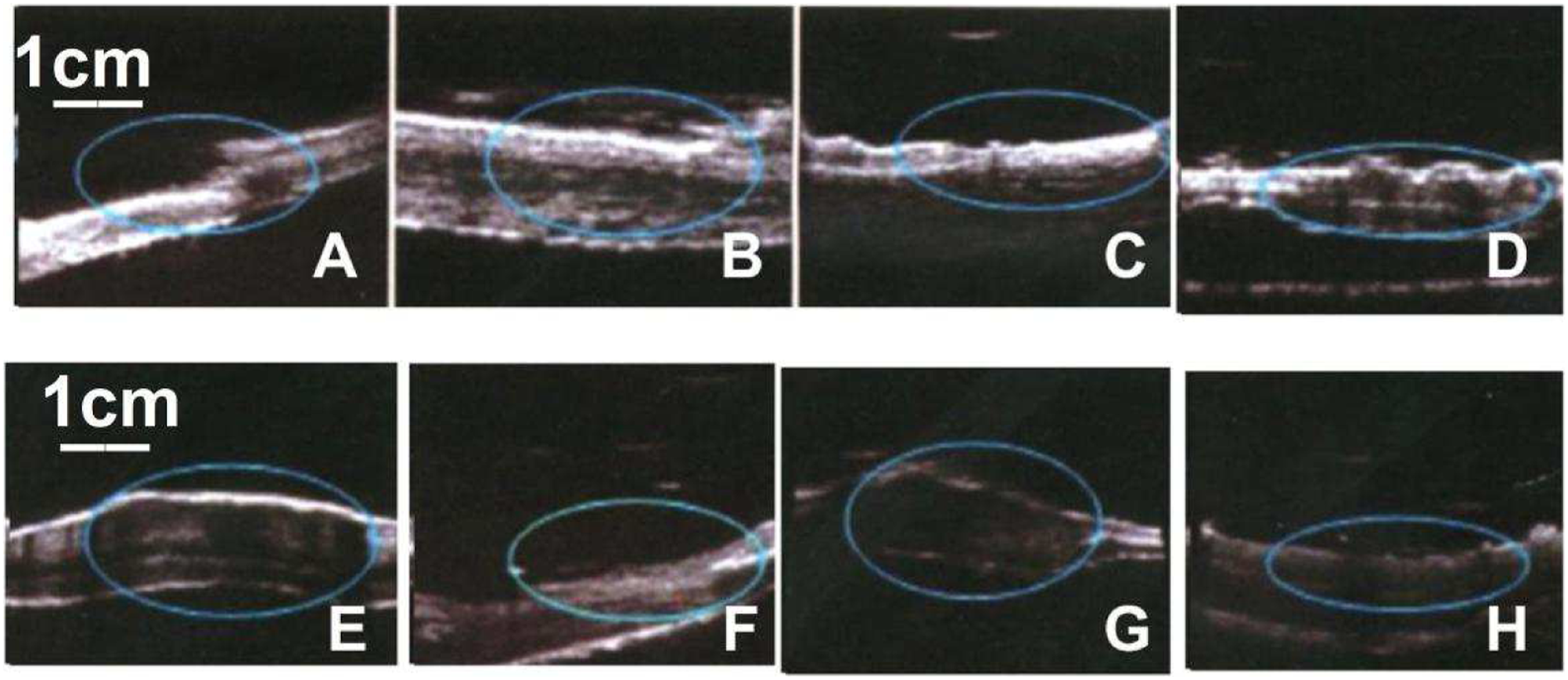 The STs of rabbit ears were measured by the color Doppler ultrasonic diagnostic instrument (GE company, USA; Figure 2). The HSs were stained by the staining of Van Gieson dye (Guangzhou Wiggs Biotechnology Co., Ltd., China) and Hematoxylin-eosin staining (Shanghai biyuntian Biotechnology Co., Ltd, China). Ultrasonic image of rabbit ear. (a-h) showed the ultrasonic image of rabbit ear on the 1st, 3rd, 5th, 7th, 11th, 16th, 20th and 28th day after operation. The oval area was the location of the scar.