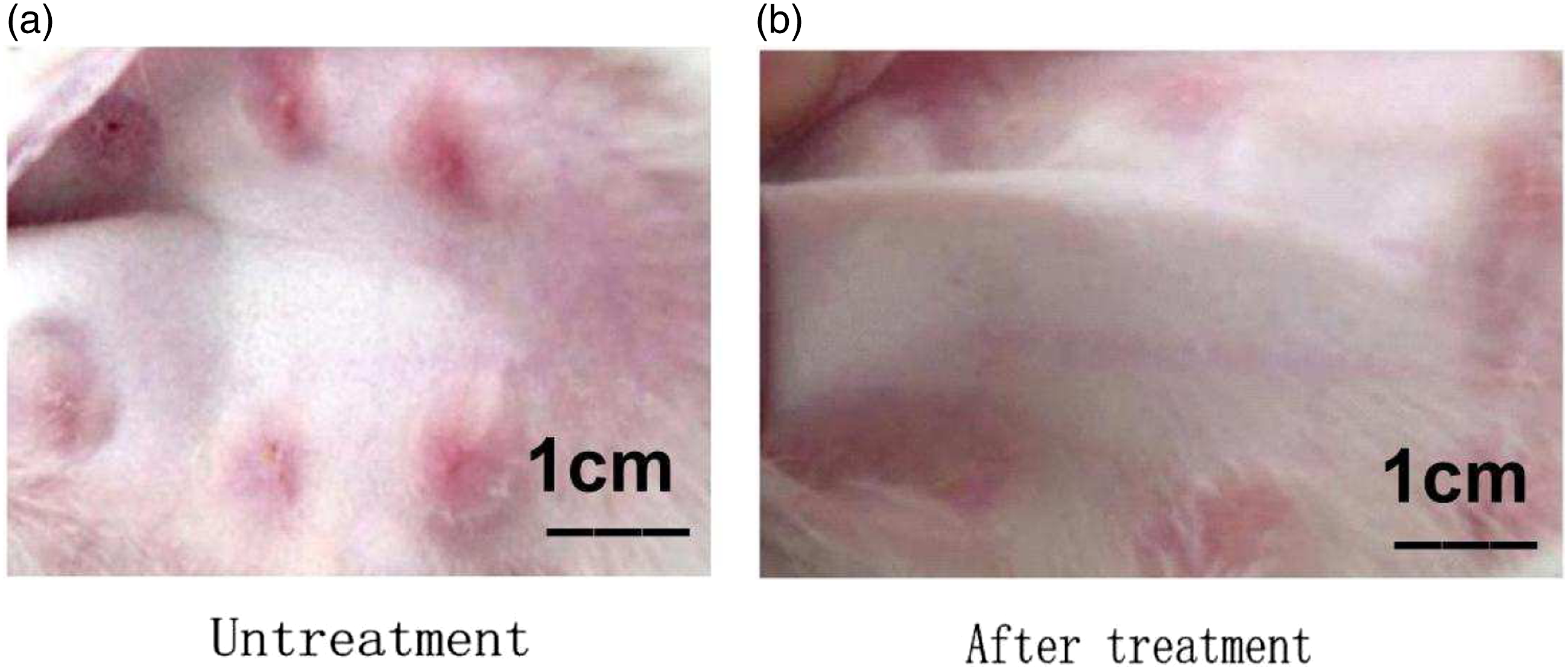 As shown in Figure 3 and Table 1. The experimental group (Figure 3(b)) had softer, shallower and thinner HS than the scar group (Figure 3(a)). The appearances of HS. (a) showed the appearance of HS in the scar group on the day prior to treatment, (b) showed the appearance of HS in the experimental group on the 42nd day after the first treatment. HS = hypertrophic scar. Comparison on scar parameters among the groups ( Note: (q test) Compared with the control group. $