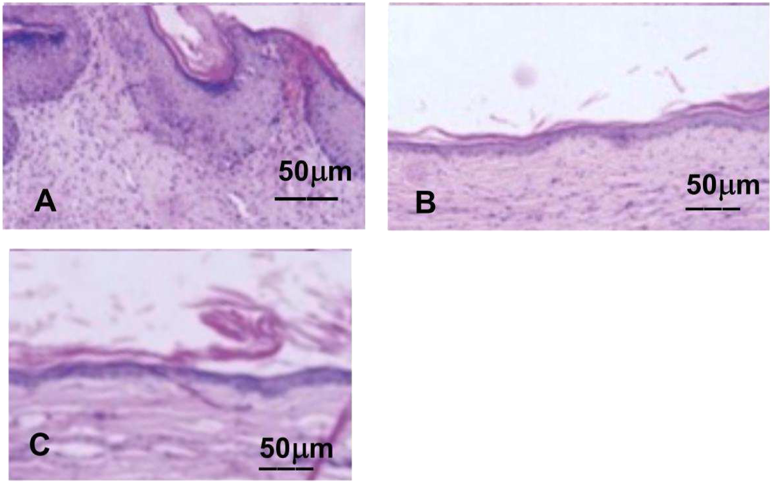To investigate whether treatment improved HSs, Van Gieson staining was conducted. As shown in Figures 4 and 5 and Table 1. In the scar group, scar structure was compact, collagen was abundant and arranged disorderly, and fibroblasts were increased. The collagen and fibroblasts were less in the experimental group than those in the scar groups and more than those in the control group. The appearance of Hematoxylin-eosin staining for HS. (a, b) and (c)showed the appearance of Hematoxylin-eosin staining at a 100x magnification for HS on rabbit’s ear in the scar group, the experimental group and the control group, respectively. Scar group (a) showed irregular and abundant fibroblasts; Fibroblasts decreased in experimental group (b) and decreased significantly in control group (c). HS = hypertrophic scar. The appearance of Hematoxylin-eosin staining for HS. (a, b) and (c)showed the appearance of Van Gieson staining at a 200x magnification for HS on rabbit’s ear in the scar group, the experimental group and the control group, respectively. The collagen fibers in scar group (a)were denser, thicker and more disordered. Typical fascicular collagen fibers appeared in the experimental group (b), while the collagen fibers in the control group (c) were orderly and less dense. HS = hypertrophic scar.