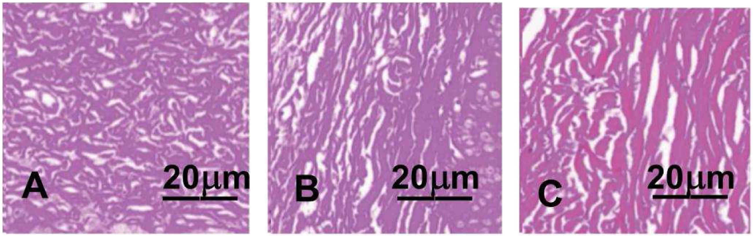 The tissue should be completely blackened under the microscope, then treated with 5% sodium thiosulfate for 1 min, washed and counterstained in Van Gieson solution for 3–5 min. Finally, the tissue was dehydrated and sealed. Then the collagen distribution was observed under a 200x magnification optical microscope.