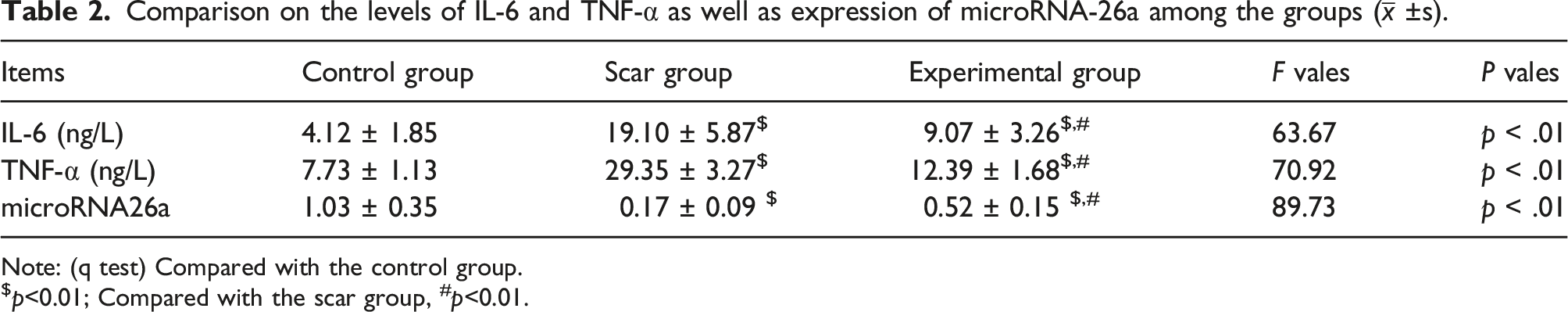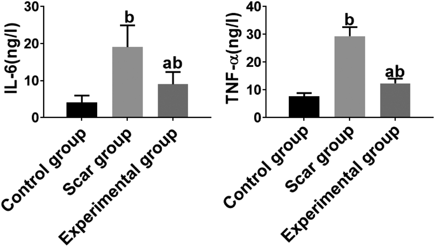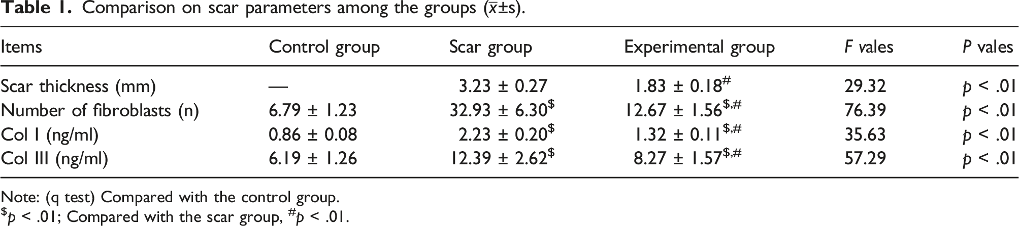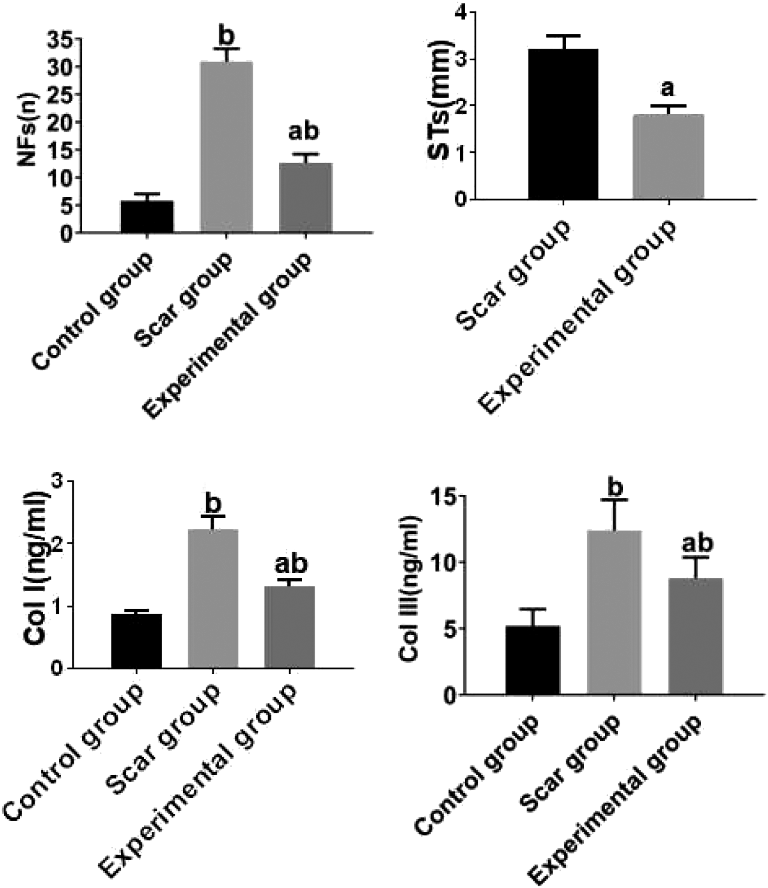 Our results showed that the levels of STs, NFs, Col I, and Col III in the experimental group were significantly lower than those in the scar group (all The scar parameters among the groups were presented. b