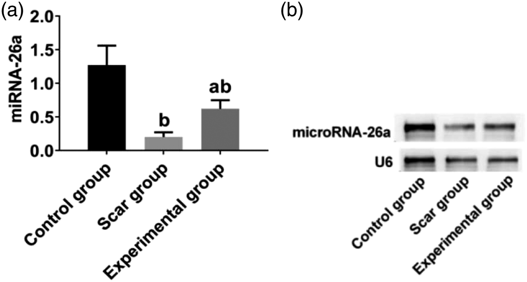 According to RT-PCR, we showed the decreased expression of microRNA-26a in the scar group compared with that in the experimental group, and in the experimental group compared with that in the control group (