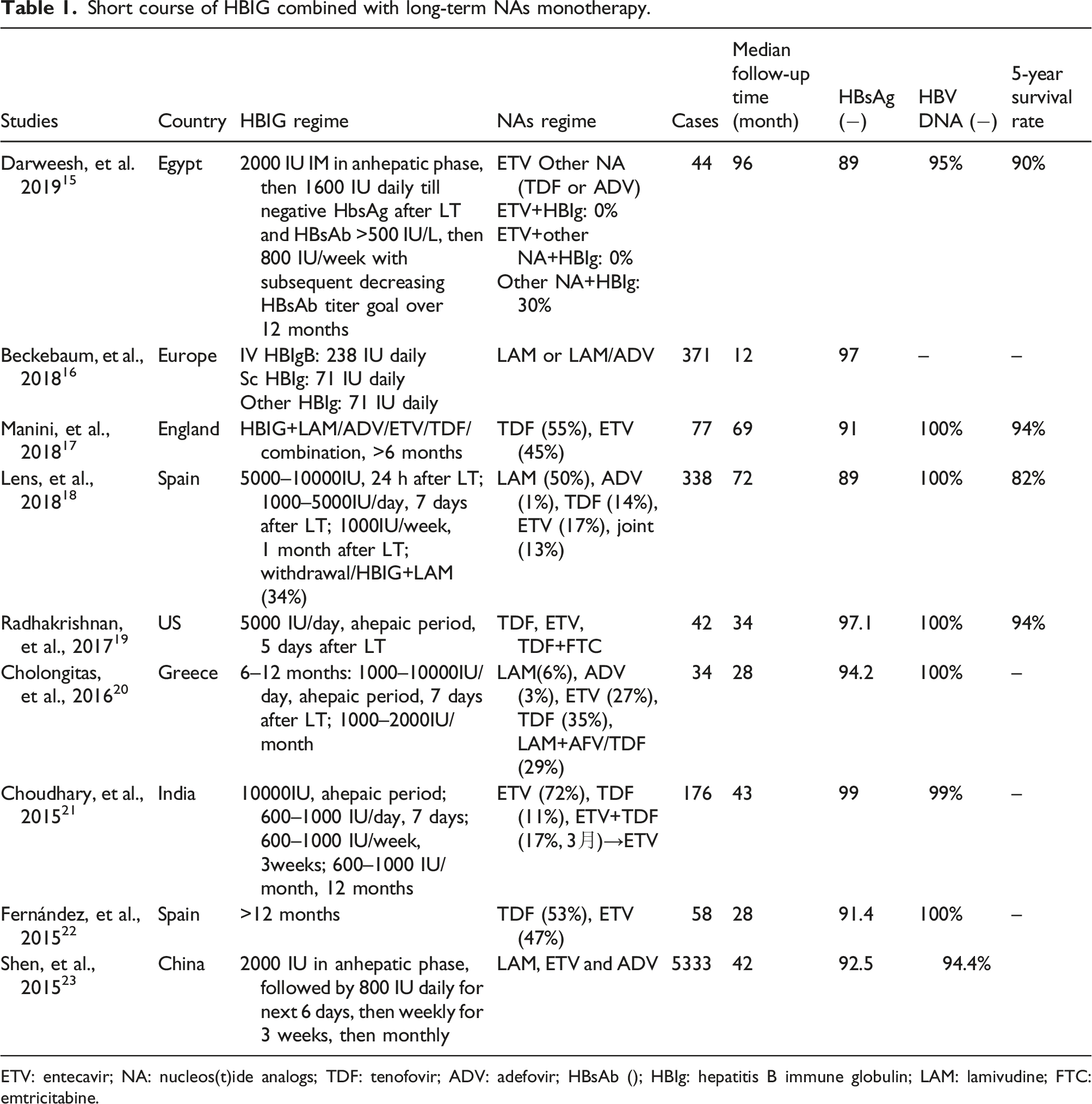 Another centre conducted a preliminary study about using HBIG only in the high-dose perioperative period followed by long-term NA use post-LT to prevent HBV recurrence. Radhakrishnan et al. 19 enrolled 42 pre-transplant HBV DNA-negative LT recipients with HBIG (5000 IU/day) in the anhepatic phase and daily for 5 days after LT. They underwent a single injection application of TDF, ETV, or TDF in combination with emtricitabine after LT to prevent HBV recurrence. During the 16-month follow-up period, only one patient was re-infected with HBV, and the survival rates post-LT were 98% and 94% at one and 5 years, respectively. These findings proved that the short-term combination of high-dose HBIG and NA monotherapy effectively prevents HBV recurrence after LT and should be the preferred strategy for managing pre-transplant HBV DNA-negative LT recipients.