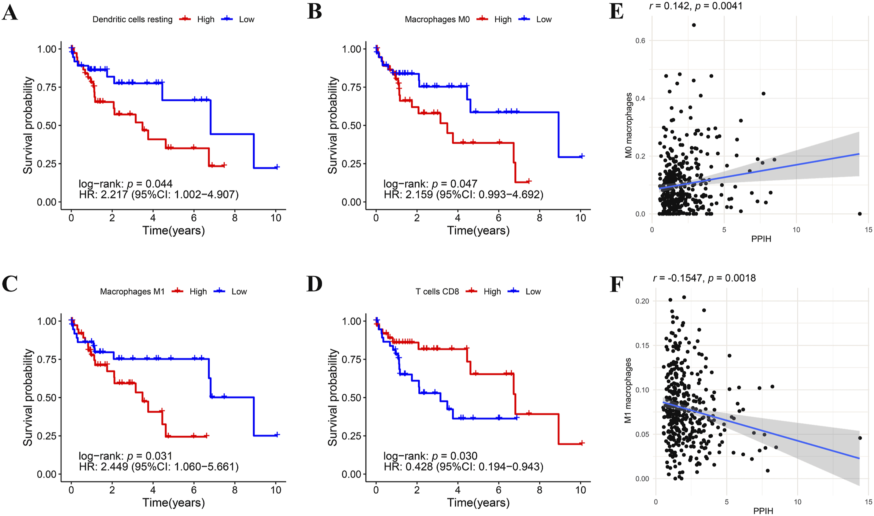 Given the differences in immune cell infiltration in HCC patients, we analyzed the relationship between tumor-infiltrating immune cells (TIICs) and prognosis. Kaplan-Meier analysis revealed that higher infiltration levels of resting dendritic cells, M0 macrophages, and M1 macrophages were associated with poor prognosis in HCC patients (Figure 3(a)–(c)), the expression level of PPIH was positively correlated with the invasion of M0 macrophages and negatively correlated with the expression level of M1 macrophages (Figure 3(e)–(f)). In contrast, higher infiltration levels of CD8 + T cells were linked to improved survival rates (Figure 3(d)), however, there was no significant correlation between the expression level of PPIH and the infiltration level of t resting dendritic cells and CD8 + T cells. Effect of TICs level on survival of HCC patients. (a–c) Kaplan-Meier analysis revealed that resting dendritic cells (A), M0 macrophages (b), M1 macrophages (c) higher infiltration level correlated with poor survival outcomes. (d) Kaplan-Meier analysis showed that lower infiltration levels of CD8 + T cells were associated with poor prognosis in HCC patients. (e and f) The expression level of PPIH is positively correlated with the infiltrating level of M0 macrophages. It is negatively correlated with the infiltration level of M1 macrophages.
