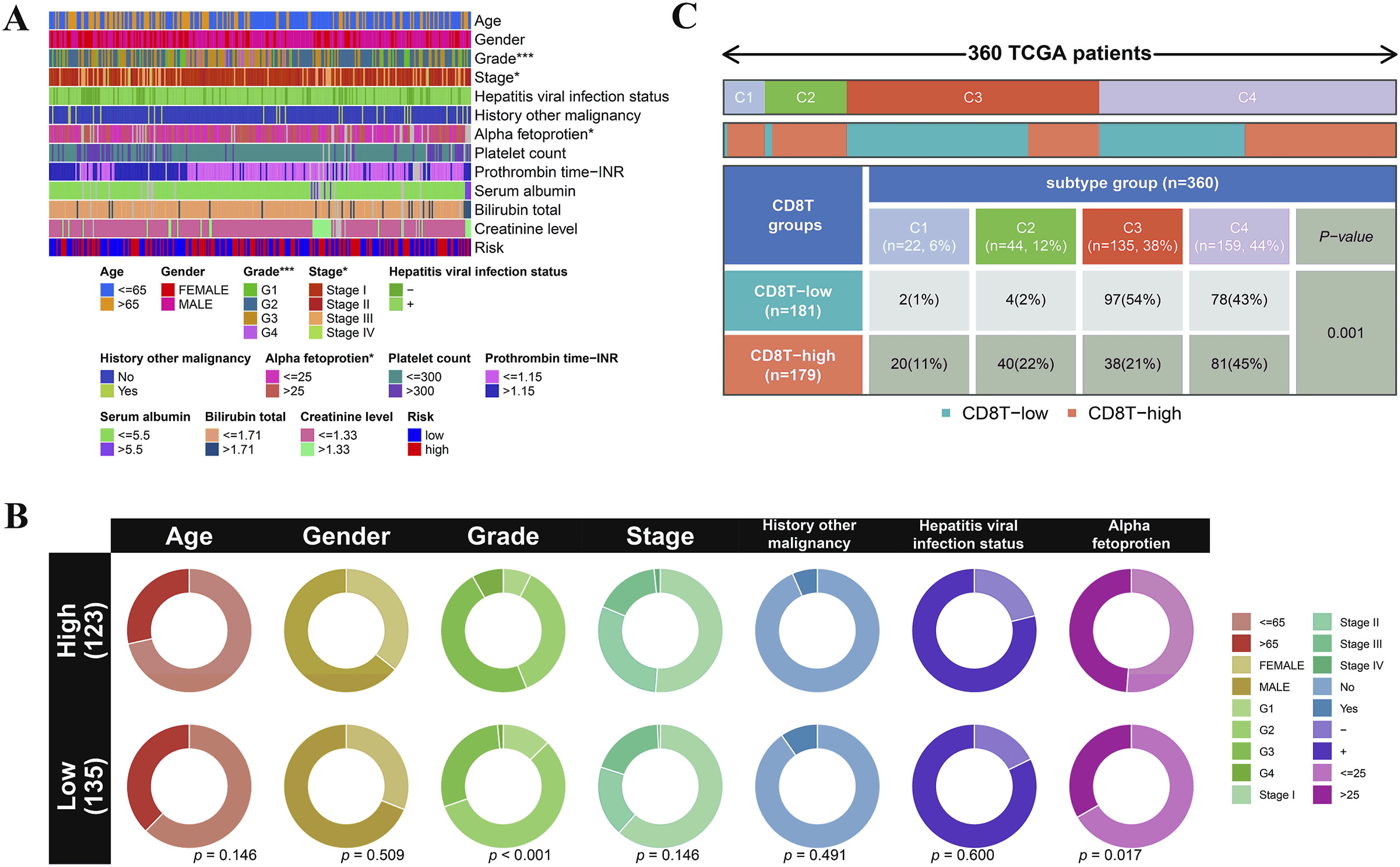 Figure 4(a) shows the clinical characteristics of the high- and low-risk groups, where it was evident that the risk score was related to tumor grade, stage and AFP, the forest plot illustrating the relationship between PPIH expression and the clinical data of HCC patients using multivariate Cox regression analysis. Additionally, we found that PPIH expression is correlated with tumor grade and alpha-fetoprotein levels (Figure S1). Relationship between risk model and clinical subtypes. (a and b) Heat map and circle chart of the risk groups and clinical subtypes for HCC patients in the TCGA cohort. Age, gender, grade, stage, History other malignancy, viral infection status and laboratory index are shown as patient annotations. (c) Comparison of the differences in immune subtype (C1-C4) between high- and low-CD8T+ groups. **