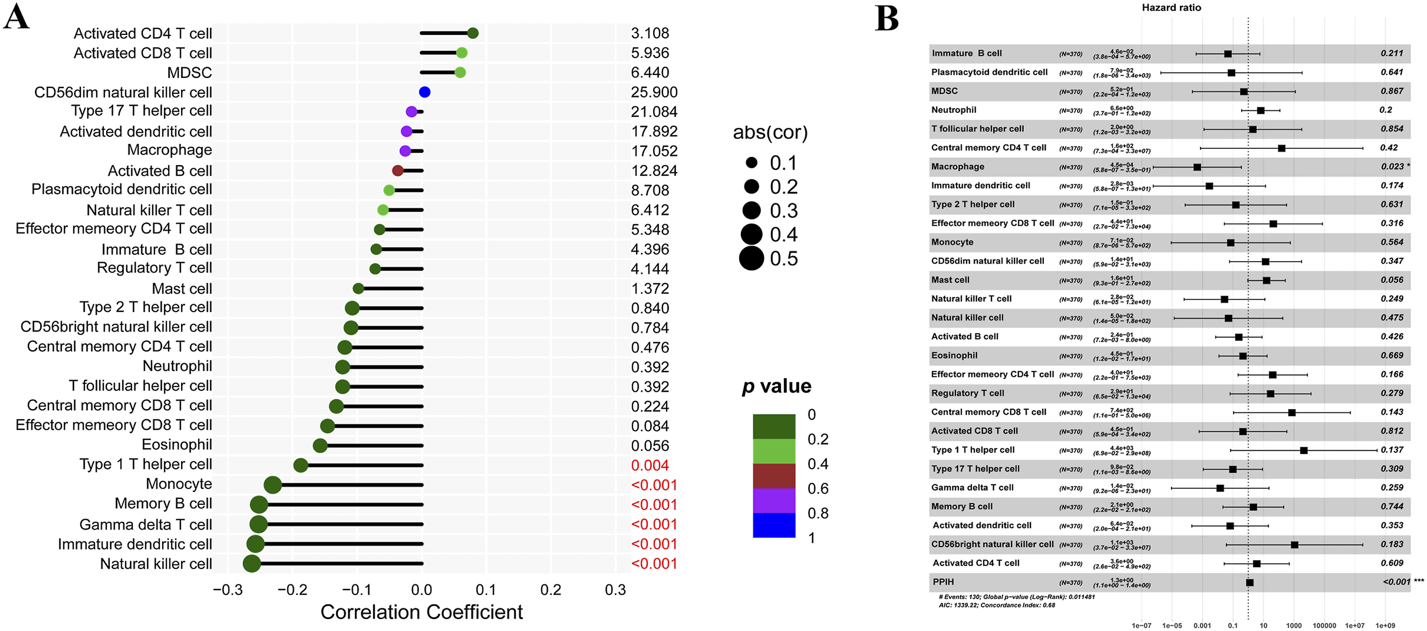 Correlations between immune cell infiltration scores and Ppih expression levels