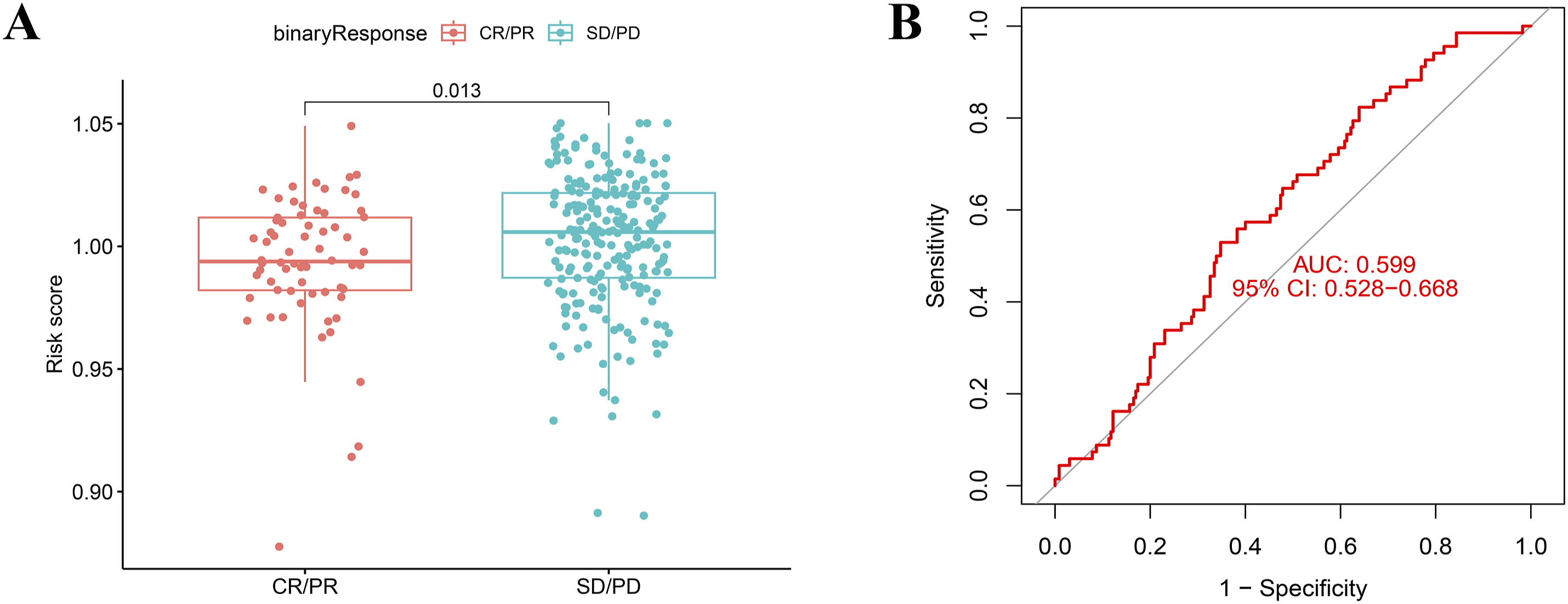To explore the role of the risk score in predicting immunotherapeutic efficacy, we analyzed expression profiles from HCC patients in the TCGA dataset. The analysis revealed that HCC patients who responded to immunotherapy had lower risk scores compared to those who did not respond (Figure 6(a)), ROC curve analysis was performed (Figure 6(b)), However, the analysis indicated that the AUC value was relatively low, with limited specificity and sensitivity. This limitation may stem from the relatively small sample size or the need for more detailed subgroup analyses in hepatocellular carcinoma patients. These findings suggest that the risk score could serve as a predictive marker for immunotherapy response in HCC patients. Box plot presents the association of risk score with immunotherapy response in the IMvigor210 cohort (a) and ROC analysis (b). CR/PR represents complete response/partial response; SD/PD represents stable disease/progressive disease.
