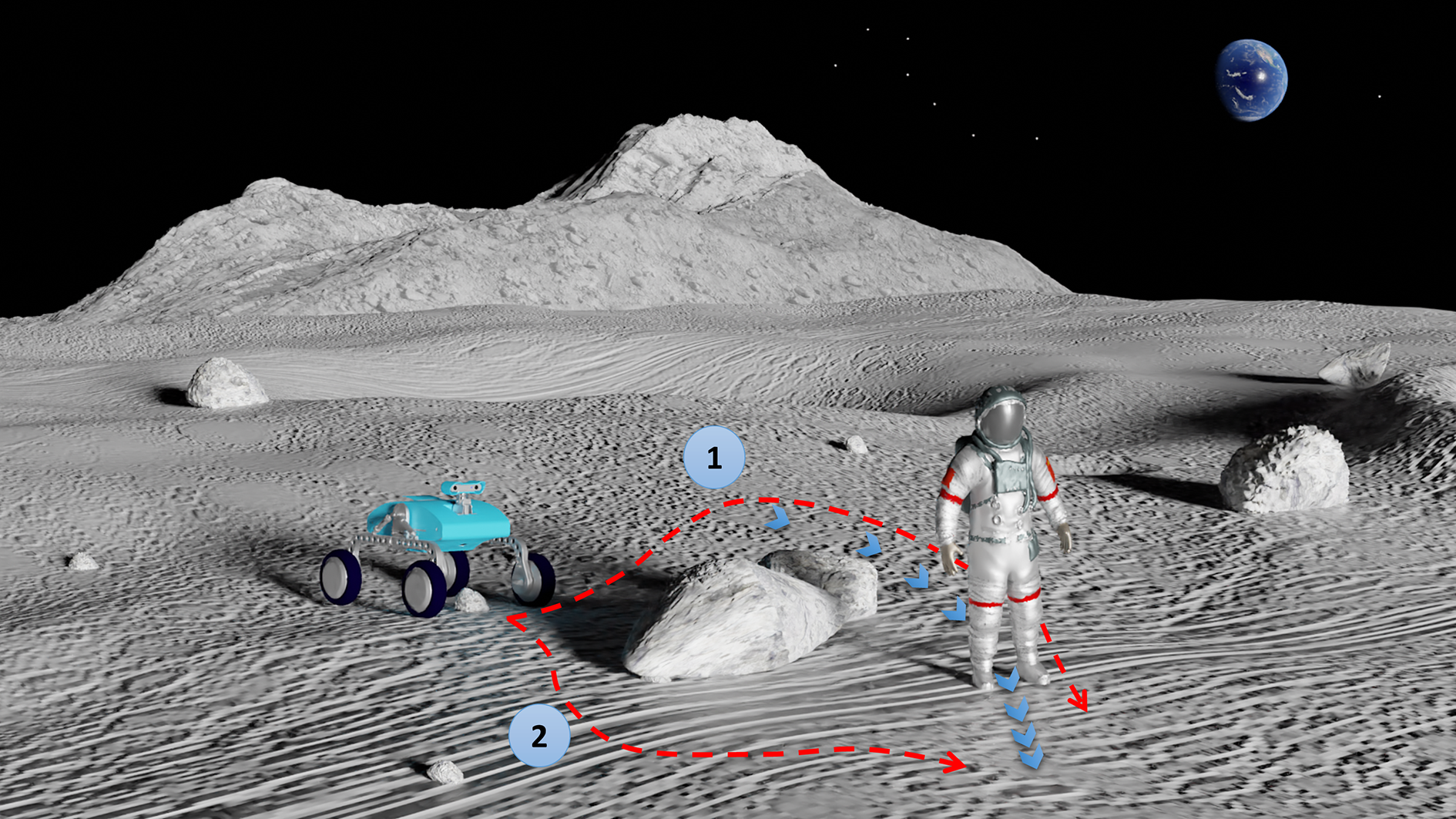 An EVA scene with an astronaut followed by an assistant robot. Path 1: an elementary path tracking the astronaut’s trajectory. Path 2: a shorter path to avoid rocks and approach to the predicted astronaut position. EVA: extravehicular activity.