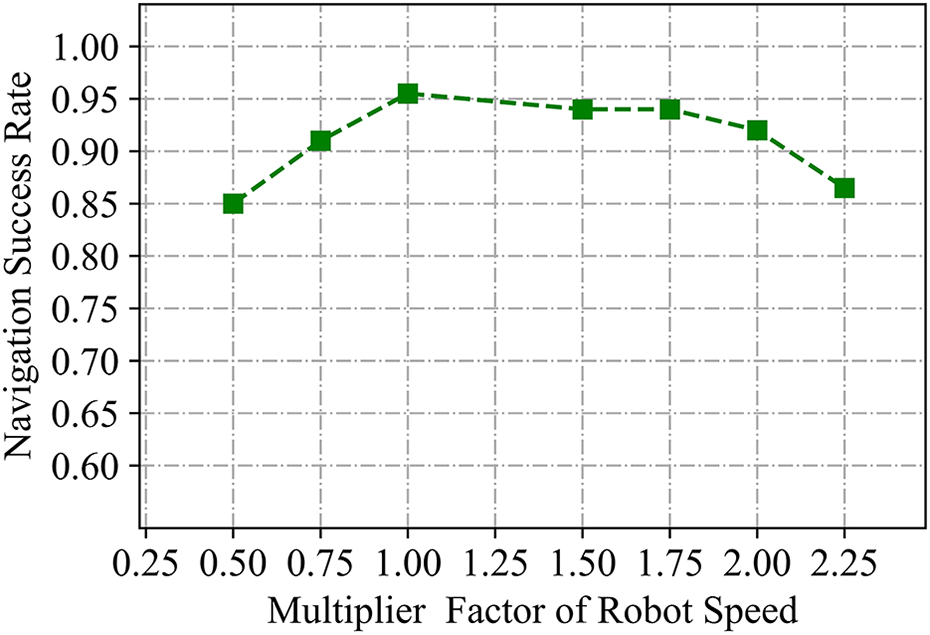 It is of great significance to investigate the robustness of the DRL-based navigator to various robot speeds, since accurately controlling the robot on extraterrestrial surfaces without precise models of friction and the softness of the ground is challenging. The robot was trained to drive ahead and steer with a maximum wheel tangential speed of 0.5 ms-1 and 0.7 ms-1, respectively. In evaluation episodes, a multiplier factor was introduced to vary the robot’s speed, which was applied to each motion in the robot’s action set. One thousand episodes of navigation tests were conducted in environment 2, and the resulting success rates over the speed multiplier factor are plotted in Figure 10. Evidently, multiplier factors as low as 0.5 and as high as 2.0 produced success rates of no less than 85% in the untrained environment, indicating that the trained navigator is robust to varying robot speeds.