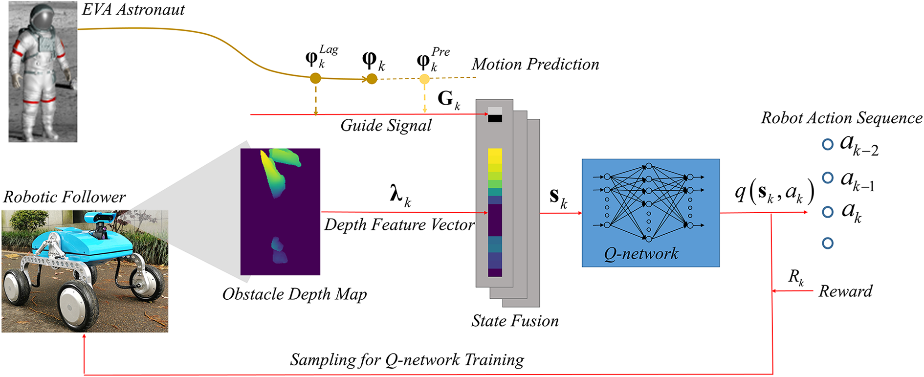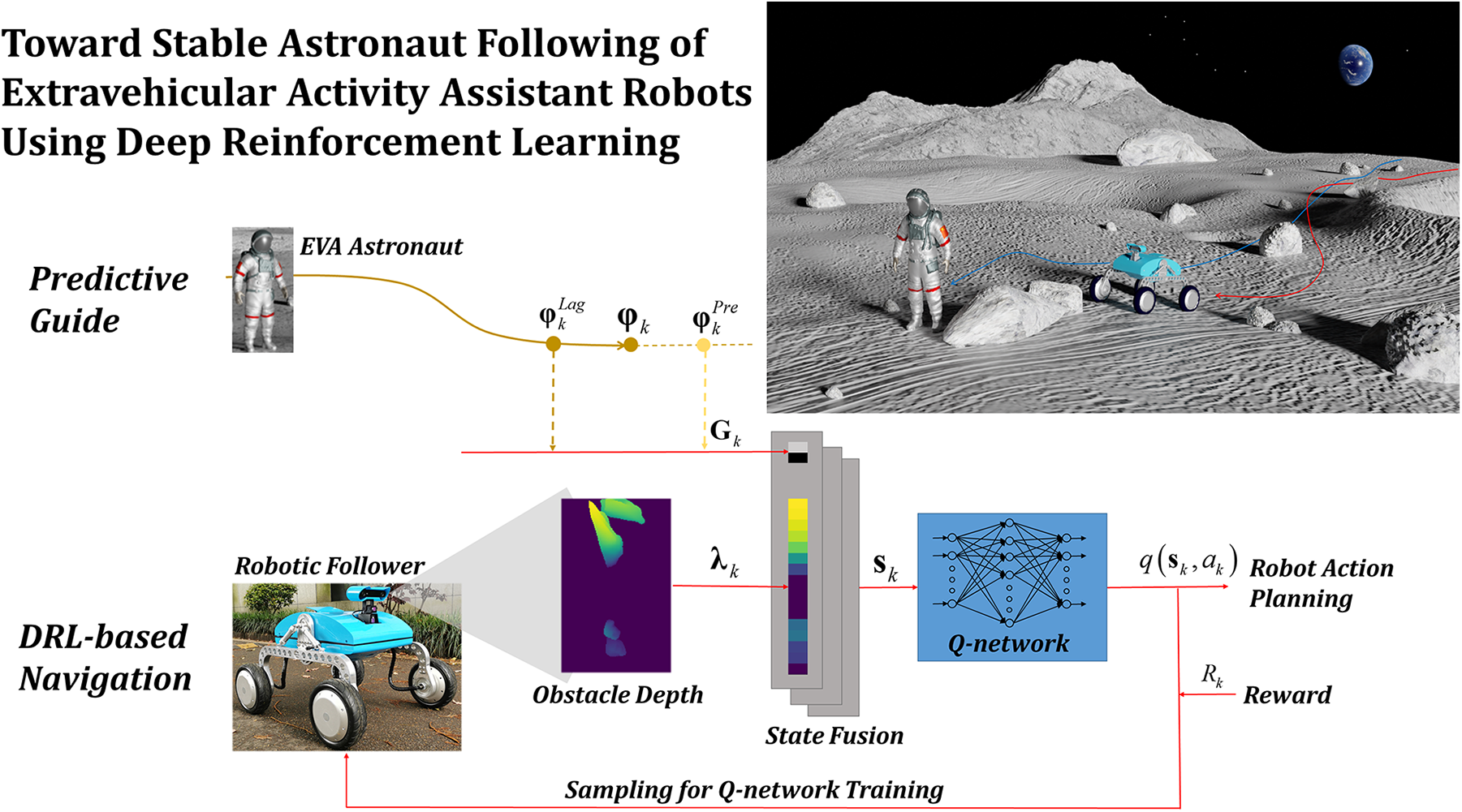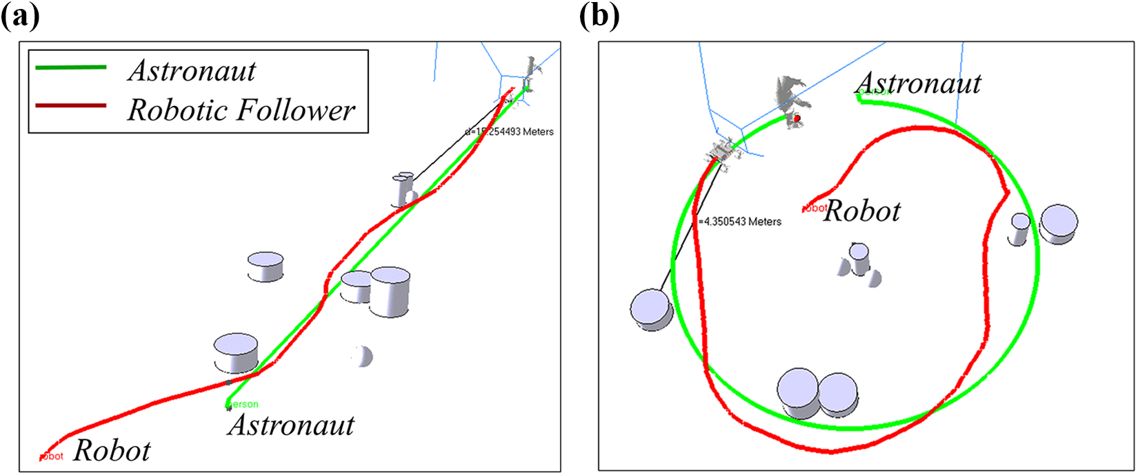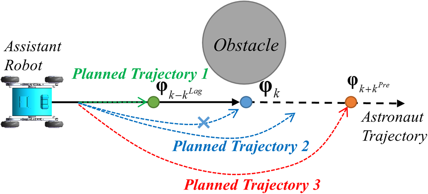 Stably following an astronaut requires maintaining a consistent astronaut–robot distance and is a prerequisite for efficient cooperation in several ways: timely and personalized responses to the astronaut’s requests, stable distance for robust visual tracking of the astronaut, as well as sustainable following. However, it can be challenging to maintain a stable astronaut–robot distance in complex extraterrestrial terrain, where rocks or sand can impede the robot. In addition, strictly following the astronaut’s trajectory is often not ideal for the robot, due to differences in their size, mobility, and gait. Even if the robot possesses obstacle avoidance capabilities, efficient coordination is required for stable following distances. Existing astronaut following strategies typically do not consider following stability in the presence of obstacles, in which either the robot is directly controlled to maintain a fixed following distance based on stereo vision powered astronaut detection and location, without considering the hazards, 3 or the obstacle avoidance technique is implemented independently of astronaut following. 6