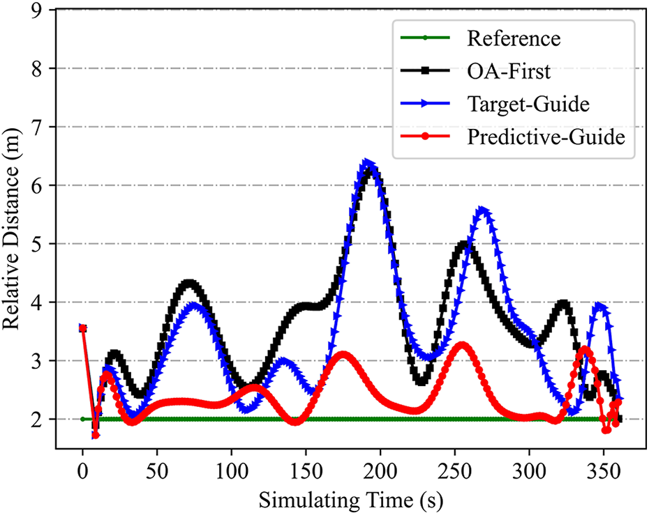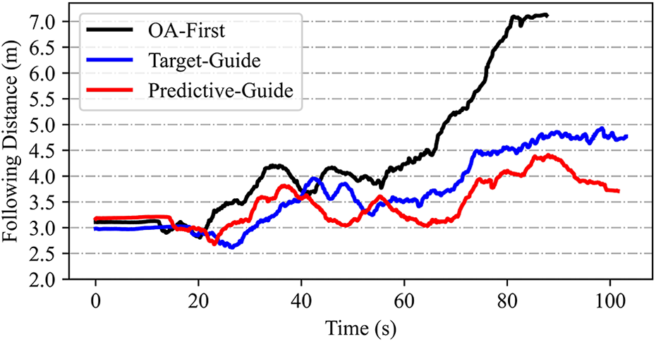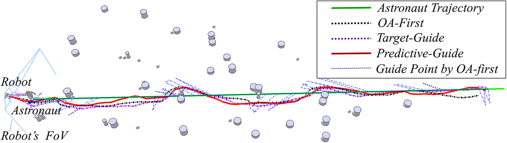 Predictive knowledge of the astronaut’s future movements, one of the primary contributions of this study, was included in the predictive-guide strategy to assist the navigator in planning an ideal following sequence, which was expected to improve following stability. Quantitative analyses were conducted to determine the advantages of the proposed technique. The OA-first and target-guide techniques, based on the trained DRL navigator, were included for comparison purposes, as discussed below.