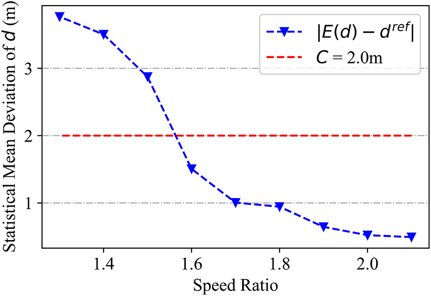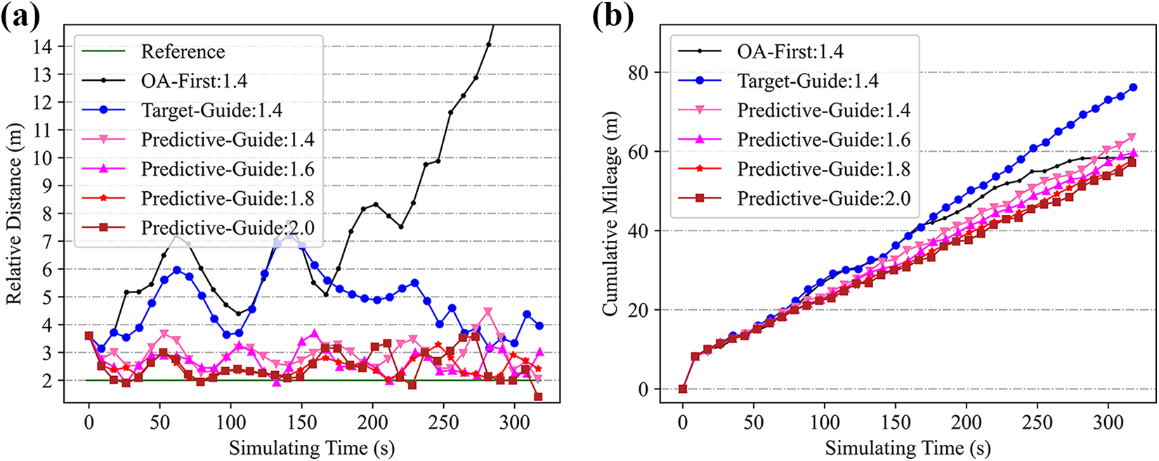 Intuitively, robots traveling at higher speeds can more easily approach a walking astronaut in an obstructed environment. In this section, the ratio of the robot’s speed to the astronaut’s walking speed is quantitatively investigated as a crucial factor affecting following distance stability. Figure 14 depicts astronaut following test results for various speed ratios. As the speed ratio decreased, the average astronaut–robot distance increased significantly. It was also difficult for the robot to maintain a stable relative distance when the speed ratio decreased to 1.4. In this case, both the target-guide and predictive-guide strategies produced maximum distance values exceeding 7.0 m. In addition, the OA-first simulation terminated after 200s, as the astronaut–robot distance had diverged beyond the navigator’s trained coverage. In summary, higher robot speeds provide improved stability for astronaut following. Figure 14(b) demonstrates that faster moving speeds can also reduce cumulative mileage during the following process, as the robot avoids obstacles and follows the astronaut more efficiently. Furthermore, mean deviation