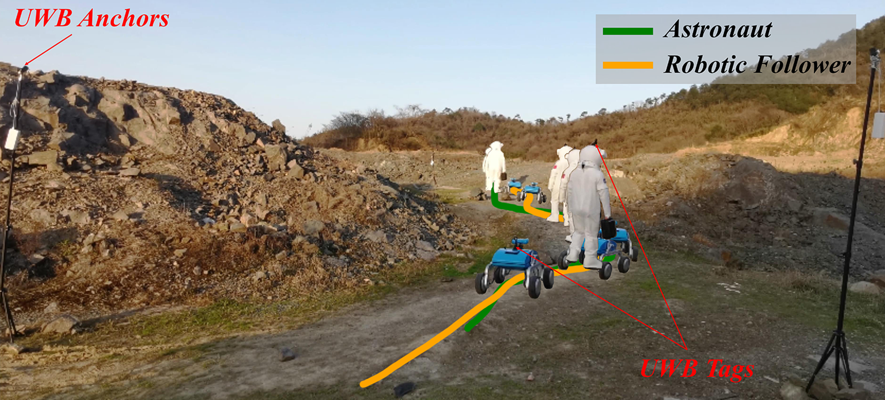 The experimental scenario at a Mars-like site. The robot running the predictive-guide strategy tries to follow the analog astronaut walking along a winding path with rocks and slopes. The UWB tags are installed onside the astronaut’s helmet and robot’s electrical box to record the trajectories. UWB: ultra-wideband.