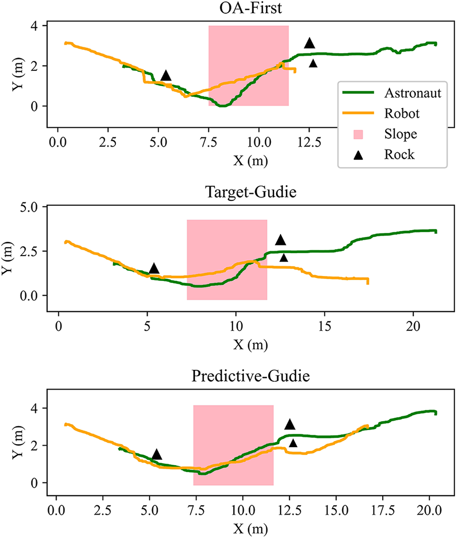 Three following strategies were tested comparatively, namely the OA-first strategy, the target-guide strategy, as well as the predictive-guide strategy. In each test, the analog astronaut was instructed to walk along a winding path with rocks and slopes, at an average speed of 0.25 m s−1. And the robotic follower was set to move at a maximum speed of approximately 0.5 m s−1, with a control period of 1.0s. The trajectories of the astronaut and the robot, as well as the following distances by the three algorithms, were plotted in Figures 17 and 18, respectively. Interesting and obvious conclusions can be drawn as follows: Rocks and slopes may interfere the following motion of the robot, resulting in a temporary increase in the astronaut–robot distance, as illustrated in Figure 18, at about 20s and 70s. The OA-first strategy has a poor coordination ability in target following and obstacle avoiding, resulting in irreversible divergence of the following distance, hence missing the astronauts after finishing the climbing the slope; while by the target-guide strategy or the predictive-guide strategy, the robot can timely respond to and continuously follow the astronaut. In case of the narrow passage that only the astronaut can pass, the robot can autonomously choose the side with smaller obstacles to go and resume following afterward. The predictive-guide strategy performs best in preventing the interference of obstacles, maintaining the variation of following distance within 1.3 m. That is to say, the method enables more stably astronaut following in the presence of obstacles, which is optimized by predictive calculations.