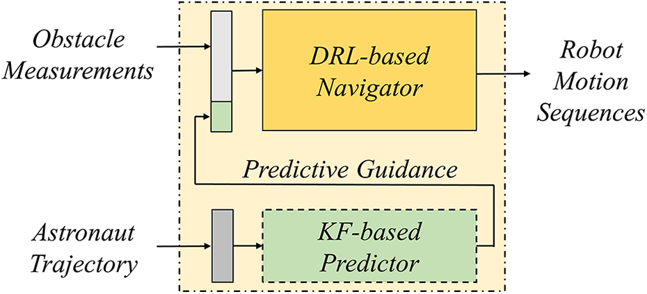 The framework of the predictive-guide strategy consists of a DRL powered navigator and a KF-based predictor, as shown in Figure 3. The predictor was used to acquire predictive guidance information based on the astronaut’s trajectory, which was then fused with local obstacle measurements and provided to the navigator for robot behavior planning. We suggest astronaut following and obstacle avoidance could be coordinated simultaneously in a predictive manner, using this hierarchal framework.